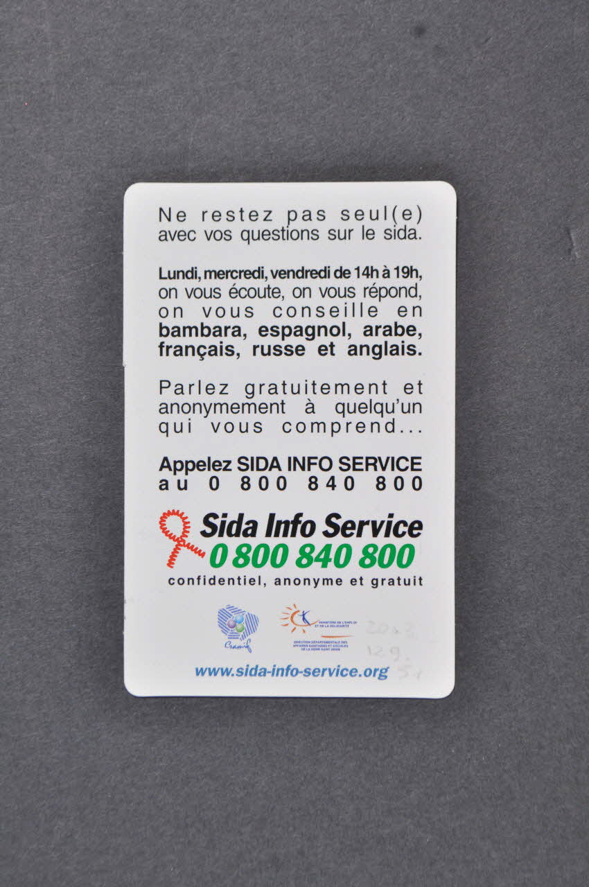 Ne restez pas seul(e) // avec vos questions sur le sida. // Lundi mercredi et vendredi // de 14 h à 19 h, // on vous écoute, on vous répond, // on vous conseille en // bambara, espagnol, arabe, // français, russe et anglais. // Parlez gratuitement et anonymement // à quelqu'un qui vous comprend... // Appelez Sida Info Service // au 0 800 840 800 // (accueil en français). // // En parler ça aide // // Sida Info Service // 0 800 840 800 // confidentiel, anonyme et gratuit // // www.sida-info-service.org, versoAdresse, texte, nom d'association, logo