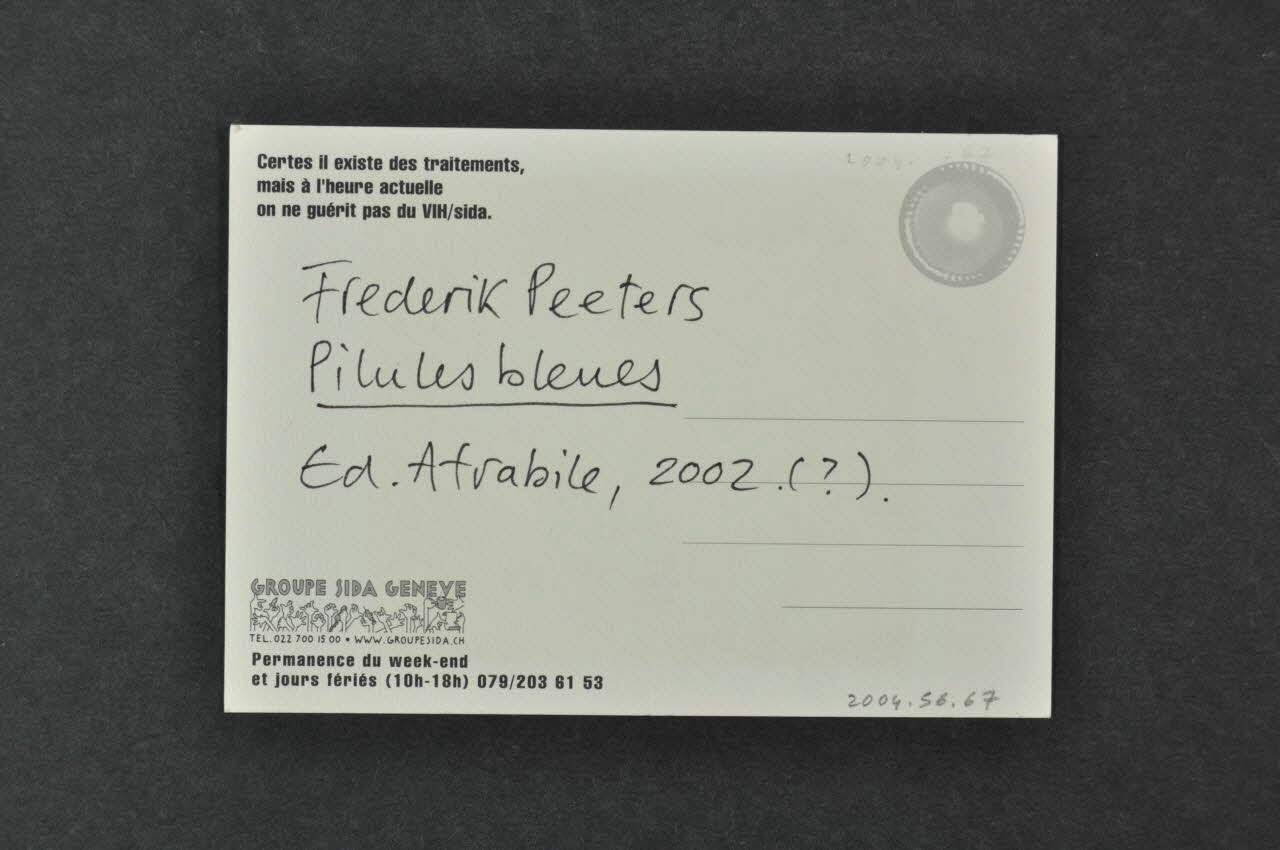Certes il existe des traitements, // mais à l'heure actuelle // on ne guérit pas du VIH/sida. (Texte imprimé dans le coin supérieur gauche), versoFrederik Peeters // Pilules bleues // Ed. Arabie, 2002 (?) (Texte manuscrit inscrit au stylo noir au centre de l'espace), versoAdresse, logo, nom d'association, numéro