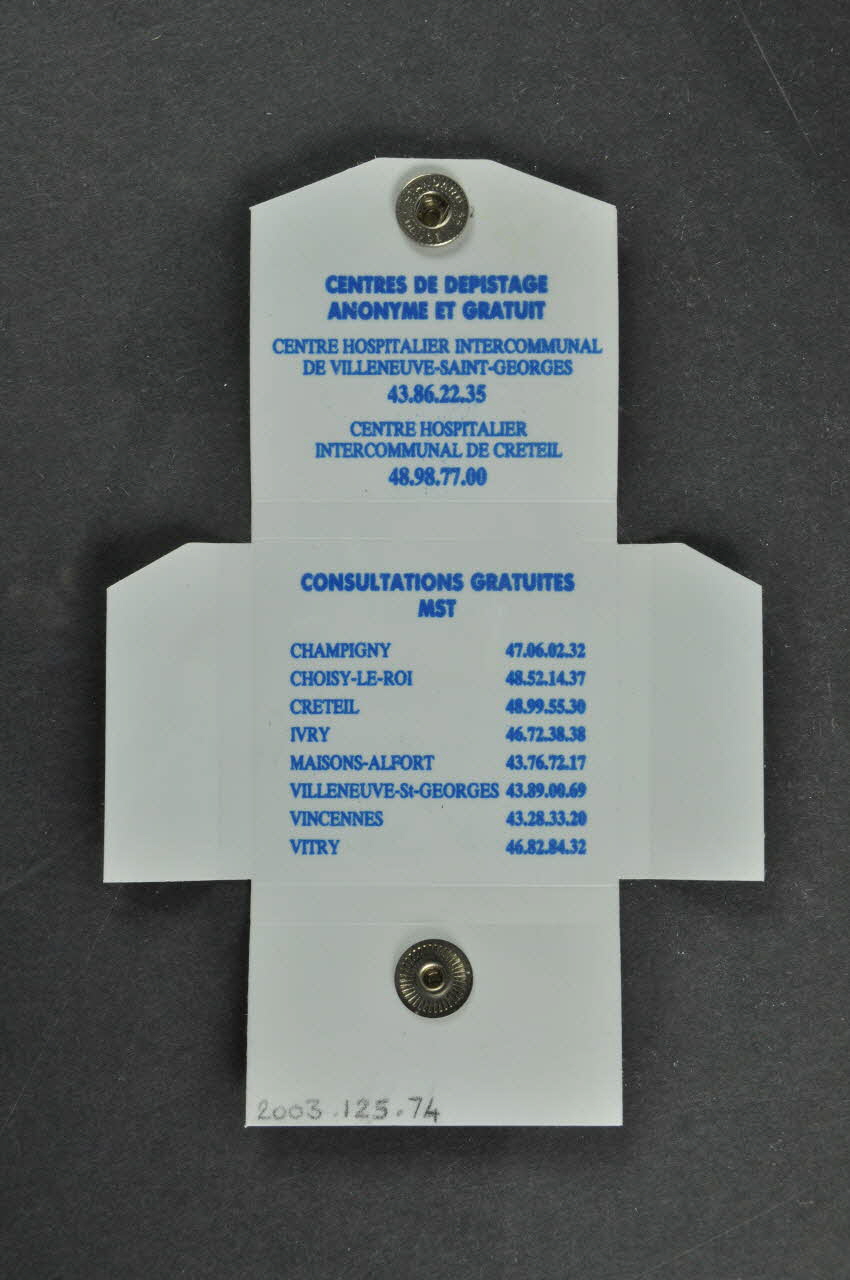A l'intérieur, en bleu, on trouve les numéros de téléphone des centres de dépistage anonymes et gratuits du Val de Marne (Villeneuve-Saint-Georges et Créteil) et des consultations gratuites MST (Champigny, Choisy-le-Roi, Créteil, Ivry, Maisons-Alfort, Villeneuve-Saint-georges, Vincennes, Vitry)