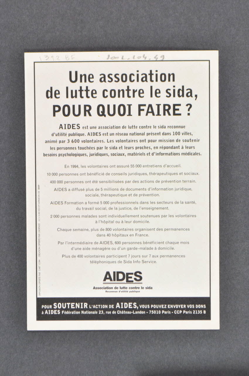 Une association / de lutte contre le sida, / POUR QUOI FAIRE ? / AIDES est une association de lutte contre le sida reconnue / d'utilité publique. AIDES est un réseau national présent dans 100 villes, / animé par 3 600 volontaires. Les volontaires ont pour mission de soutenir / les personnes touchées par le sida et leurs proches, en répondant à leurs / besoins psychologiques, juridiques, sociaux, matériels et d'informations médicales. / En 1994, les volontaires ont assuré 55 000 entretiens d'accueil. / 10 000 personnes ont bénéficié de conseils juridiques, thérapeutiques et de sociaux. / 400 000 personnes ont été sensibilisées par des actions de prévention terrain. / AIDES a diffusé plus de 5 millions de documents d'information juridique, / sociale, thérapeutique et de prévention. / AIDES Formation a formé 5 000 professionnels dans les secteurs de la santé, / du travail social, de la justice, de l'enseignement. / 2 000 personnes malades sont individuellement soutenues par les volontaires / à l'hôpital ou à leur domicile. / Chaque semaine, plus de 800 volontaires organisent des permanences / dans 40 hôpitaux de France. / Par l'intermédiaire de AIDES, 600 personnes bénéficient chaque mois / d'une aide ménagère ou d'un garde-malade à domicile. / Plus de 400 volontaires participent 7 jours sur 7 aux permanences / téléphoniques de Sida Info Service. (Texte imprimé en noir, au dos, dans un cadre rectangulaire. La première phrase est une question imprimée en plus gros caractères.), versoIl suffirait de pas grand-chose / pour que les malades du sida / puissent avaler quelque chose à l'HOPITAL. (Phrase inscrite en noir, en haut de la face avant de la carte.), rectoP.O.L. (Signature du dessin, placée en dessous.), rectoDIFFUSION OFFERTE PAR CART' COM CREATION OFFERTE PAR L'AGENCE R.C.S. B 682 005 079 IMPRIME EN CEE BDDP (Inscription imprimée en petit, le long du côté gauche et concernant la réalisation de la carte.), versoPOUR CONTACTER LE COMITE LE PLUS PROCHE TAPEZ 3615* AIDES / PRESENT DANS 100 VILLES / *(1,29 F la minute) (Inscription imprimée en rouge sur une bande noir dans le bas de la face avant de la carte. Le nom de l'association est inscrit à la suite, en noir sur une bande rouge.), rectoAIDES / Association de lutte contre le sida / Reconnue d'utilité publique (Logo de AIDES avec le E légèrement plus bas. Il est imprimé en dessous du texte, au dos de la carte.), versoDécor