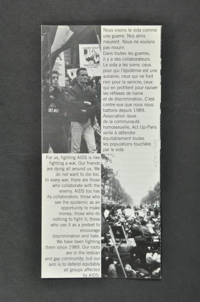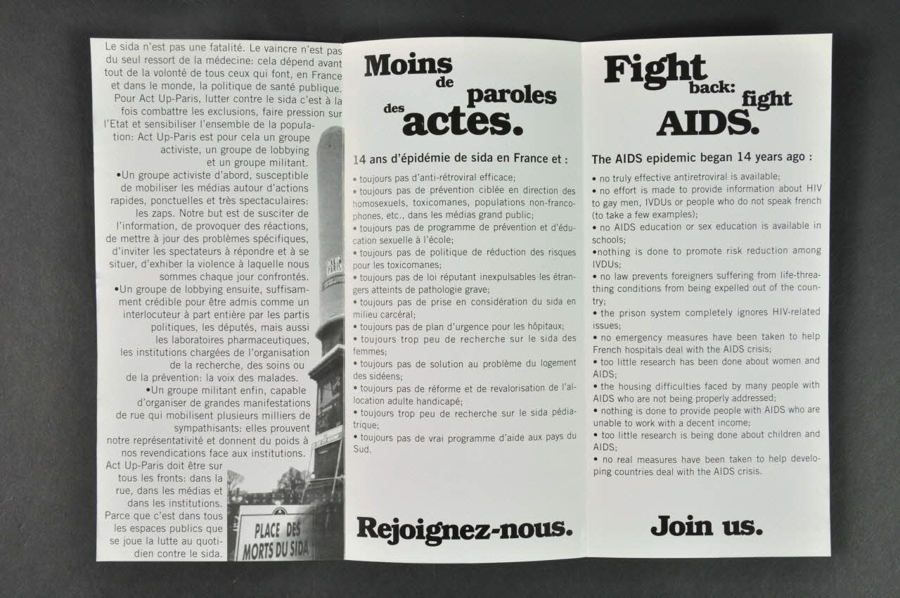 Le sida n'est pas une fatalité. le vaincre n'est pas du seul ressort de la médecine : cela dépend avant tout de la volonté de tous ceux qui font en France et dans le monde, la politique de santé publique. Pour Act Up-Paris, lutter contre le sida, c'est à la fois combattre les exclusions, faire pression sur l'Etat et sensibiliser l'ensemble de la population : Act Up-Paris est pour cela un groupe activiste, un groupe de lobbying et un groupe militant. // Un groupe activiste d'abord, susceptible de mobiliser les médias autour d'actions rapides, ponctuelles et très spectaculaires, les zaps. Notre but est de susciter de l'information, de provoquer des réactions, de mettre à jour des problèmes spécifiques, d'inviter les spectateurs à répondre et à se situer, d'exhiber la violence à laquelle nous sommes chaque jour confrontés. // Un groupe de lobbying ensuite, suffisamment crédible pour être admis comme un interlocuteur à part entière par les partis politiques, les députés, mais aussi les laboratoires pharmaceutiques, les institutions chargées de l'organisation de la recherche, des soins ou de la prévention : la voix des malades. // Un groupe militant enfin, capable d'organiser de grandes manifestations de rue qui mobilisent plusieurs milliers de sympathisants: elles prouvent notre représentativité et donnent du poids à nos revendications face aux institutions. Act Up-Paris doit être sur tous les fronts : dans la rue, dans les médias et dans les institutions. // Parce que c'est dans tous les espaces publics que se joue la lutte au quotidien contre le sida. (verso du premier volet), à l'intérieurNous vivons le sida comme une guerre. Nos amis meurent. Nous ne voulons pas mourir. // Dans toutes les guerres il y a des collaborateurs. Le sida a les siens : ceux pour qui l'épidémie est une aubaine; ceux qui ne font rien pour la vaincre; ceux qui en profitent pour raviver les réflexes de haine et de discrimination. C'est contre eux que nous nous battons depuis 1989. // Association issue de la communauté homosexuelle, Act Up-Paris veille à défendre équitablement toutes les populations touchées par le sida. (à l'arrière du dépliant), versoAct Up-Paris // est une association de lutte contre le sida. (de la couverture), en basMoins de paroles, des actes. // 14 ans d'épidémie en France et : // - toujours pas d'anti-rétroviral efficace; // - toujours pas de prévention ciblée en direction des homosexuels, toxicomanes, populations non-francophones, etc... dans les médias grand-public; // - toujours pas de programme de prévention et d'éducation sexuelle à l'école; // - toujours pas de politique de réduction des risques pour les toxicomanes; // - toujours pas de loi réputant inexpulsables les étrangers atteints de pathologie grave; // - toujours pas de prise en considération du sida en milieu carcéral; // - toujours pas de plan d'urgence pour les hôpitaux; // - toujours trop peu de recherche sur le sida des femmes; // - toujours pas de solution au problème du logement des sidéens; // - toujours pas de réforme et de revalorisation de l'allocation adulte handicapé; // - toujours trop peu de recherche sur le sida pédiatrique; // - toujours pas de vrai programme d'aide aux pays du Sud. // Rejoignez nous (page intérieure médiane, traduction sur la troisième page intérieure), à l'intérieurLogo, nom d'association