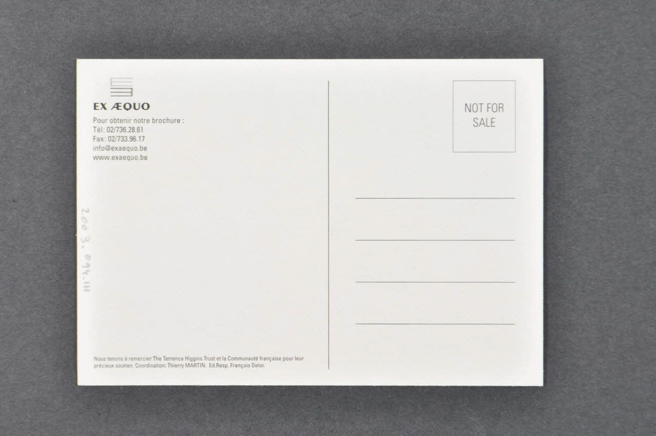 Le recto présente deux silhouettes masculines floues, l'une au premier plan en chemise bleue ouverte, l'autre au second plan, de dos, en chemise rouge. Des inscriptions sont présentes sous l'image et au verso. Celui-ci est divisé en deux par une ligne verticale ; la partie de droite est lignée pour l'adresse du destinataire, avec un cadre pour le timbre.Inscriptions