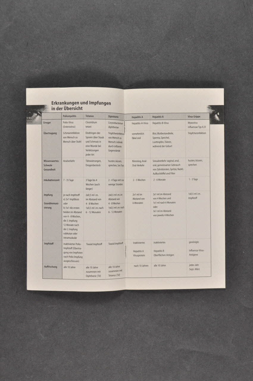 Impressum [...] p.2 // // Editorial [...] p.3 // // Als schwuler Mann den Impfschutz // aktualisieren - was soll das? [...] p.4 // // Warum soll ich mich impfen lassen? [...] p.4 // // Polio-Erkrankungen 1996 [...] p.5 // // Was tut sich bei einer Impfung // in meinem Körper? [...] p.6 // // Welche Impfung soll ich // durchführen lassen? [...] p.6 // // Muss ich die Impfung bezahlen? [...] p.7 // // Ich bin positiv - // soll ich mich impfen lassen? [...] p.7 // // Impfungen bei HIV - Infektion [...] p.7 // // Erkrankungen und Impfungen // in der Übersicht [...] p.8 // // Poliomyelitis [...] p.10 // // Diphtherie [...] p.11 // // Tetanus [...) p.12 // // Virusgrippe [...] p.12 // // Hepatitis A [...] p.13 // // Hepatitis B [...] p.14 // // Infoschriften [...] p.15 (Imprimés en noir et gras), à l'intérieurLogo