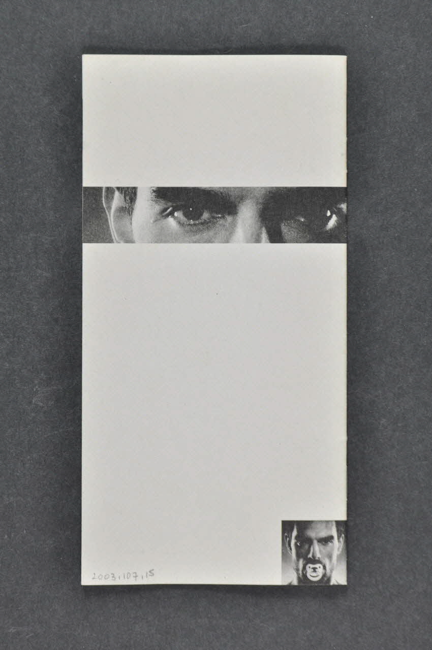 Le recto présente une photographie imprimée dans la moitié supérieure en forme de bande. Il s'agit d'une paire d'yeux d'homme. Il s'agit du même regard que l'on retrouve sur la photo sous-jacente imprimée au format portrait. Elle représente un visage d'homme avec une tétine dans la bouche. Des inscriptions sont imprimées en noir en dessous. Une petite photographie est imprimée dans l'angle inférieur gauche. Elle montre un détail de la photographie du dessus: un oeil. Et un logo est imprimé dans l'angle inférieur droit en noir et blanc. La photographie des yeux du recto est replaçée à l'identique au verso. Et la photographie du visage à la tétine est réimprimée en petit format dans l'angle inférieur droit. A l'intérieur, les inscriptions des textes sont en noir, et les titres en gras. La photographie de l'oeil vu en couverture est imprimée systématiquement sur chaque page, en bordure gauche ou droite dans la moitié supérieure, de petite tailleInscriptions