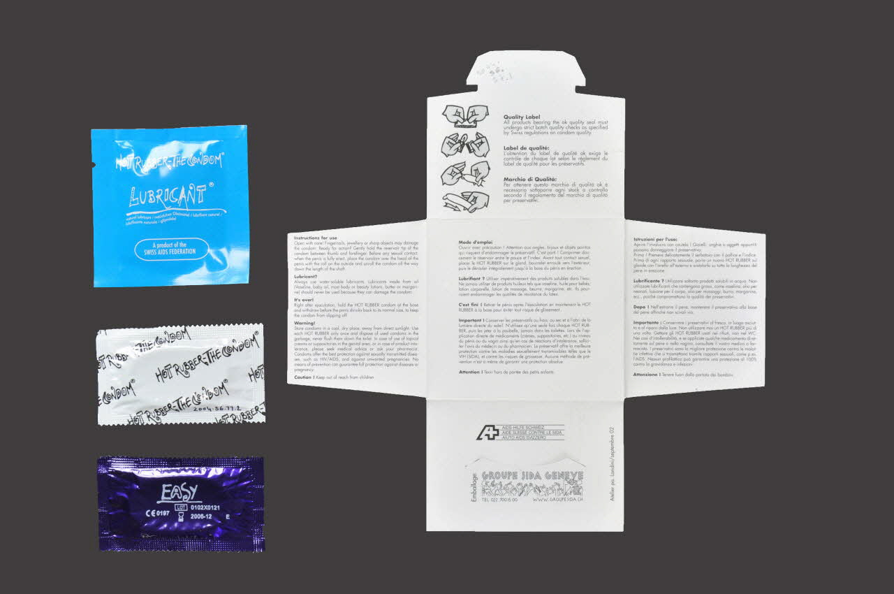 A l'intérieur sont imprimés des instructions d'usage en français, anglais, italien et quatre petits schémas, les logos de Aide Suisse Contre le sida et Groupe sida Genève.