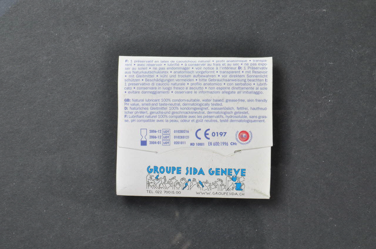 Au dos, en bleu sur fond blanc, on trouve une description du préservatif en français, anglais, allemand et italien et, en bas, le logo du Groupe Sida Genève.