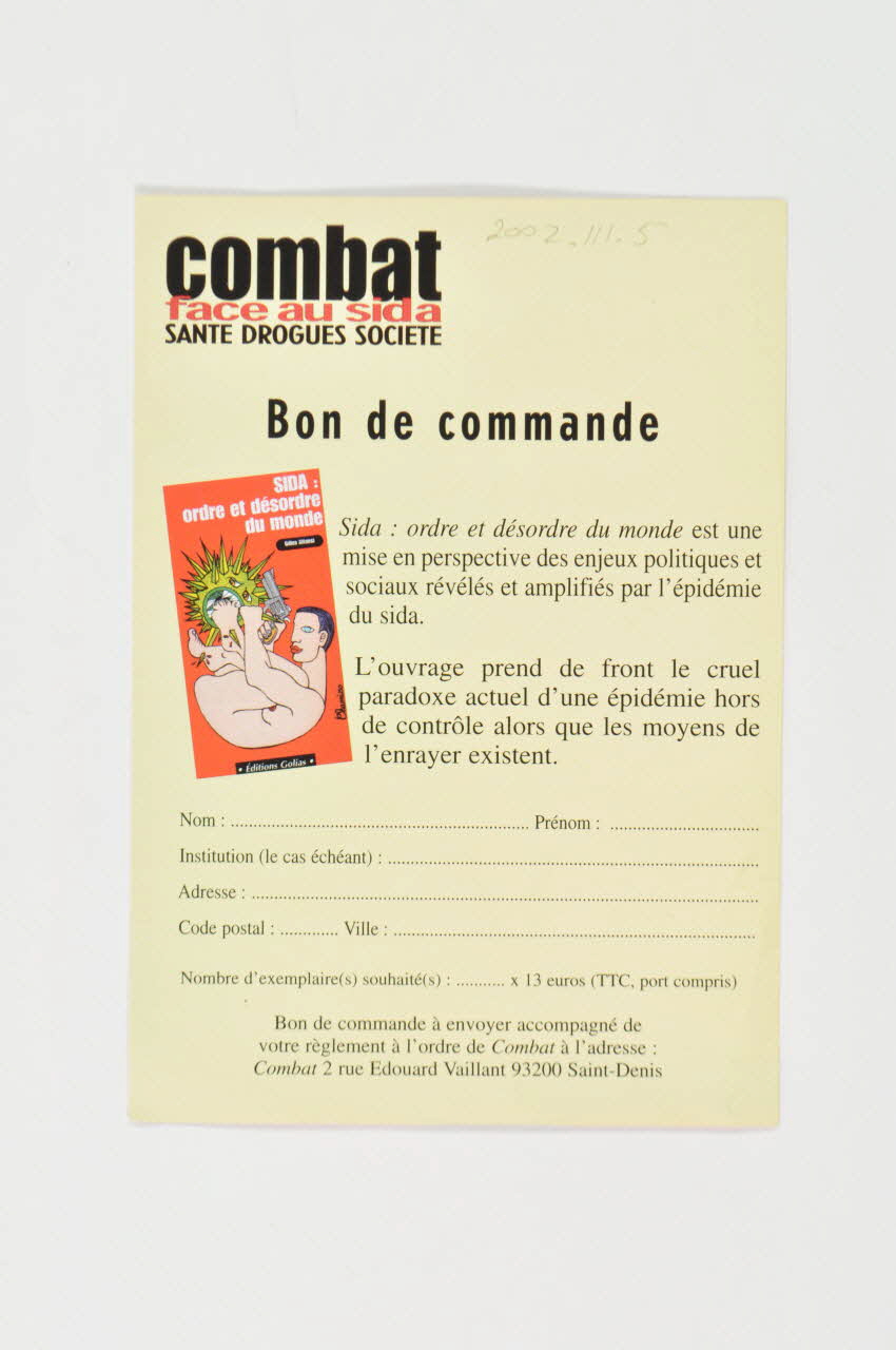 Bon de commande // Sida : ordre et désordre du monde est une mise en perspective. des enjeux politiques et sociaux révélés et amplifiés par l'épidémie du sida. L'ouvrage prend de front le cruel paradoxe actuel d'une épidémie hors de contrôle alors que ls moyens de l'enrayer existent. Bon de commande à envoyer accompagné de // votre règlement à l'ordre de Combat à l'adresse : // Combat 2 rue Edouard Vaillant 93200 Saint-Denis, versoDécor