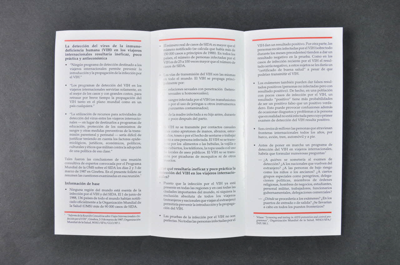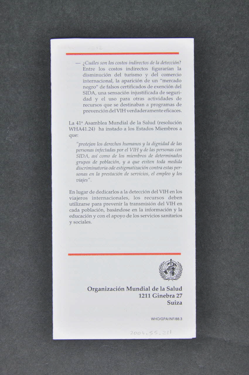 Dépliant, "Declaracion sobre deteccion del virus de la inmunodeficiencia humana en los viajeros internacionales" (Déclaration sur le dépistage du VIH dans les voyages internationaux)