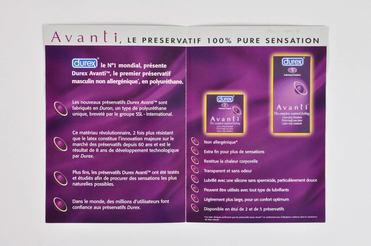 Sur la page de gauche : Durex (logo) le n°1 mondial, présente "Durex Avanti", le premier préservatif masculin non allergénique, en polyuréthane. - Les nouveaux préservatifs Durex Avanti sont fabriqués en Duron, un type de polyuréthane unique, breveté par le groupe SSL - International. - Ce matériau révolutionnaire, 2 fois plus résistant que le latex, constitue l'innovation majeure sur le marché des préservatifs depuis 60 ans et est le résultat de 8 ans de développement technologique par Durex. - Plus fins, les préservatifs Durex Avanti ont été testés et étudiés afin de procurer des sensations les plus naturelles possibles. - Dans le monde, des millions d'utilisateurs font confiance aux préservatifs Durex. Sur la page de droite : En haut photo des deux boites de préservatifs, l'une de contenance 2 et l'autre de contenance 5 et en dessous : - Non allergénique *- Extra fin pour plus de sensations - Restitue la chaleur corporelle - Transparent et sans odeur - Lubrifié avec une silicone sans spermicide, particulièrement douce - Peuvent être utilisés avec tout type de lubrifiants - Légèrement plus large, pour un confort optimum - Disponible en étui de 2 et de 5 préservatifs * Les tests cliniques confirment que les préservatifs Durex Avanti ne contiennent pas d'allergènes contenus dans le caoutchouc de latex naturel.