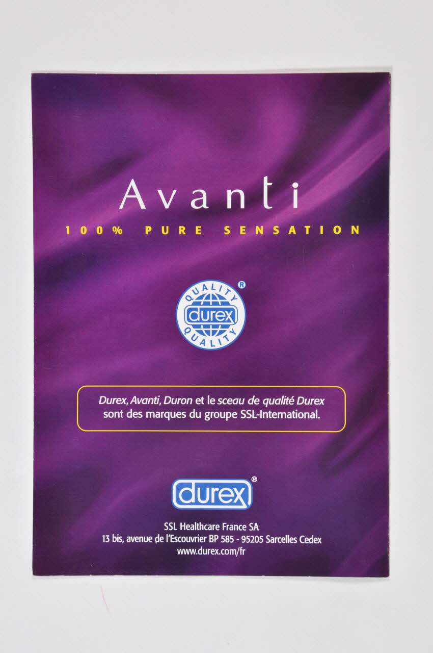 En couverture, on peut voir en partie supérieure la marque Avanti et le logo de Durex. Au centre de la page, en caractères blancs figure un texte. A l’intérieur figure une inscription en caractères blancs à cheval sur les deux pages centrales. Un petit texte blanc dans un cadre jaune est présent en partie inférieure. Puis figurent le logo et les coordonnées de Durex. Sur la page de droite, photos de deux boites de préservatifs accompagnées de plusieurs petits textesInscriptions
