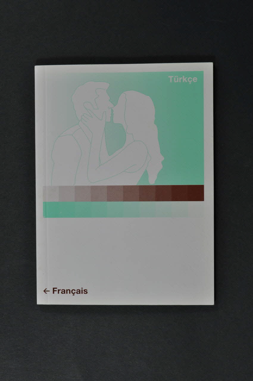 Sur la couverture du côté turc se trouve un dessin en blanc représentant un couple en train de s'embrasser, vu de profil. Cette image se trouve en haut de la couverture sur un fond vert. Sous cette image figurent une bande marron et une bande verte. La partie basse est blanche. Une inscription blanche se trouve dans le coin supérieur droit et une inscription marron dans le coin inférieur gauche. L'intérieur du côté turc est constitué d'inscriptions en vert, blanc et marron sur fond vert ou blanc. Ces inscriptions sont accompagnées de dessins blancs du même couple et de schémas explicatifs. Sur la couverture du côté français se trouve le même dessin en blanc représentant un couple en train de s'embrasser, vu de profil. Cette image se trouve en haut de la couverture sur un fond marron. Sous cette image figurent une bande verte et une bande marron. La partie basse est blanche. Une inscription blanche se trouve dans le coin supérieur droit et une inscription verte dans le coin inférieur gauche. L'intérieur du côté français est constitué d'inscriptions en vert, blanc et marron sur fond marron ou blanc. Ces inscriptions sont accompagnées de dessins blancs du même couple et de schémas explicatifs.Inscriptions
