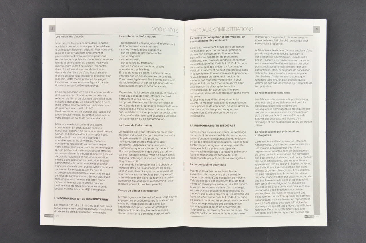 Résumé: Editorial de Victoire Patouillard : projets de lois visant les minorités, détenus malades... p.4-7 Actions. Act Up zape l'ambassade de Chine à Paris / Hani Ramadan, complice du sida / Mattéi préfère faire payer les malades plutôt que contrôler les industriels / Prostitution : des droits pour touTEs / La Réforme Européenne du médicament p. 8 Les pharmacies hospitalières prennent les malades du sida en otage p.9 Hépatite B Une politique irresponsable p.10-11 Le Delfraissy nouveau est arrivé (reconnaissance de l'expertise des associations) p.12-13 Coca-cola laisse mourir ses employéEs africainEs p.14 Doha: le question des génériques p.15 Fonds mondial : un outil de contrôle des pays riches sur les pays pauvres p.16-17 Brèves : La Chine se réveille / De Doha à Kuala Lumpur / Un tribunal thaïlandais légifère contre BMS / Afrique du Sud, Burkina p.17 Prohiber nuit gravement à la santé (prohibition du cannabis et consommation térapeutique) p.18 AG de la prévention p.18 Charte de responsabilité des établissements gays p.19 Femmes et VIH. Une rentrée pourrie p.21-23 DétenusEs malades ; combien de morts en prison faudra-t-il ? p.23 Expulsions de malades p.24 Appel à dons : 5 ans de droite, nous avons besoin d'amour et de votre soutien Encart de 4 pages au centre, en noir sur fond jaune : "Action = vie. Bulletin d'information sociale pour les personnes atteintes par le VIH, n° 46. Dossier : La loi du 4 mars 2002 relative aux droits des malades. L'accès au dossier médical / L'information et le consentement / La responsabilité médicale / Les limites du consentement des malades.