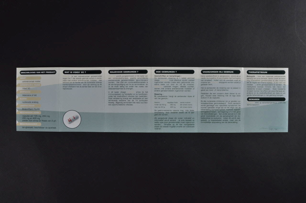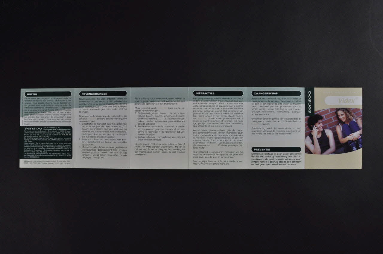 Meer weten over Videx (En savoir plus sur Videx) (Titre du dépliant en haut de la couverture.)OMSCHRIJVING VAN HET PRODUCT // WAT IS VIDEX ? // WAARVOOR GEBRUIKEN ? // HOE GEBRUIKEN ? // VOORZORGEN BIJ GEBRUIK // THERAPIETROUW // BEWAREN // NUTTIG // NEVENWERKINGEN // INTERACTIES // ZWANGERSCHAP // PREVENTIE (Titres des rubriques du dépliant.)Nom de l'association écrit en blanc dans un cartouche en haut à gauche de la couverture. (Nom de l'association écrit en blanc dans un cartouche en haut à gauche de la couverture.)Décor