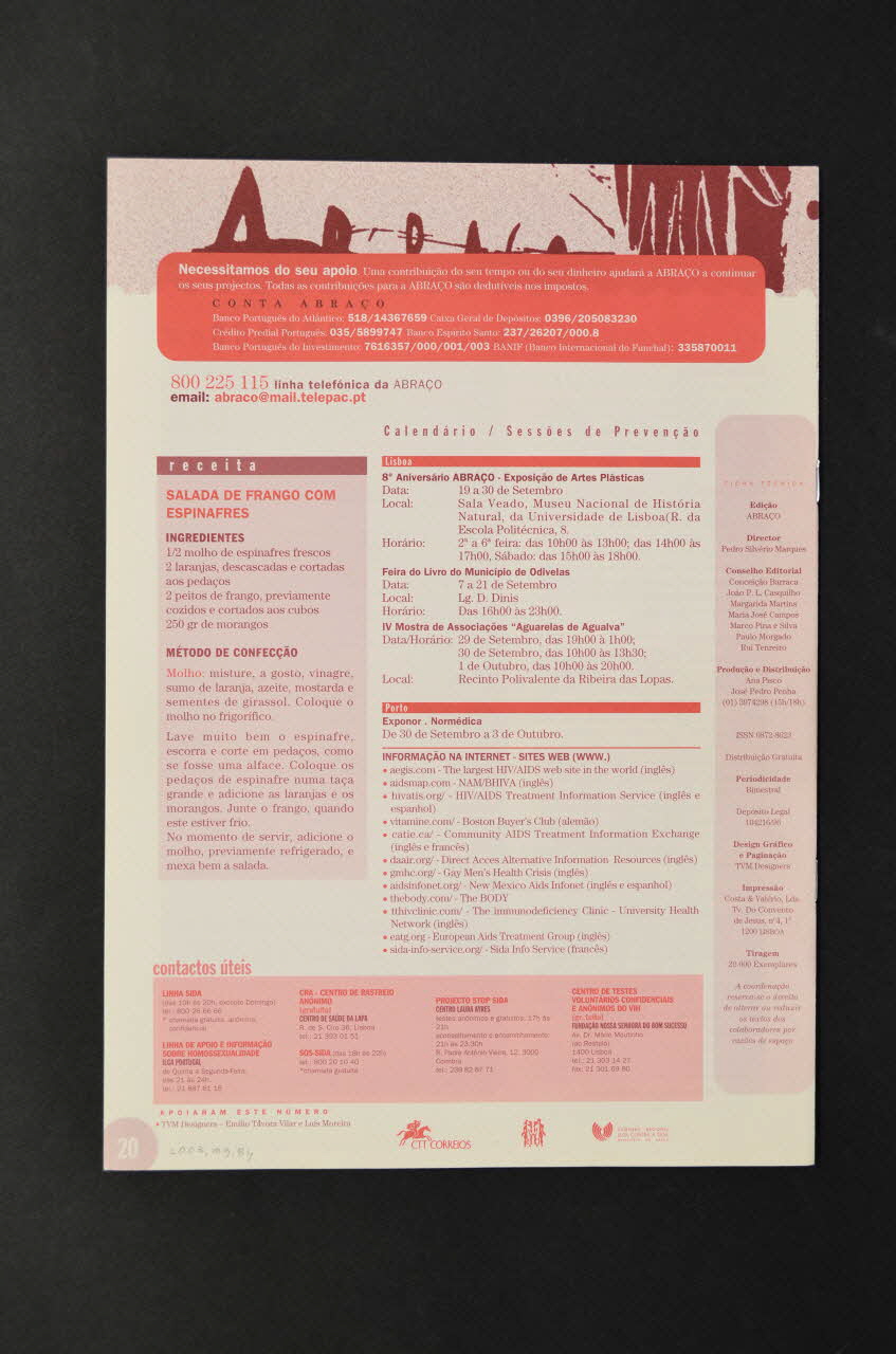 Editorial // Noticias // Durban, dia a dia // O programa comunitario de durban // Onde esta o preservativo feminino // As mães, @s filh@s e os preservativos // O oitavo aniversario da ABRACO // Cronologia de mortes misteriosas // Nordall 2000 // Aprovada a nova formulação // Acidose lactica // Tratamentos - Tudo como dantes... // As mulheres face àSIDA no ano 2000 // Mensagens // Sessões de prevenção // Glossario // Servicios ABRACO // receita // Calendario, sur la couvertureNuméro, date