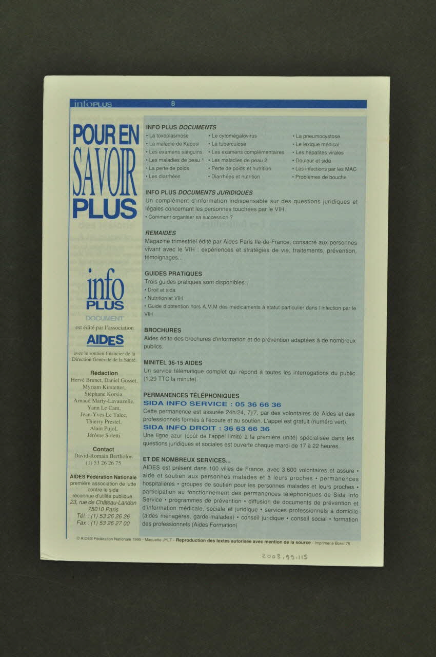 POUR EN // SAVOIR // PLUS // // // info // PLUS // DOCUMENT // esr édité par l'association // AIDES // // avec le soutien financier de la // Direction Générale de la Santé. // // Rédaction // Hervé Brunet, Daniel Gosset, // Myriam Kirstetter, // Stéphane Korsia, // Arnaud Marty-Lavauzelle, // Yann Le Cam, // Jean-Yves le Talec, // Thierry Prestel, // Alain Pujol, // Jérôme Soletti // // Contact // David-Romain Bertholon // (1) 53 26 26 75 // // AIDES Fédération Nationale // première association de lutte // contre le sida // reconnue d'utilité publique. // 23, rue de Château-Landon // 75010 Paris // Tél.: (1) 53 26 26 26 // Fax: (1) 53 26 27 00 (Sur la page 8, imprimés en bleu pour les titres et en noir pour les textes descriptifs.), rectoSommaire