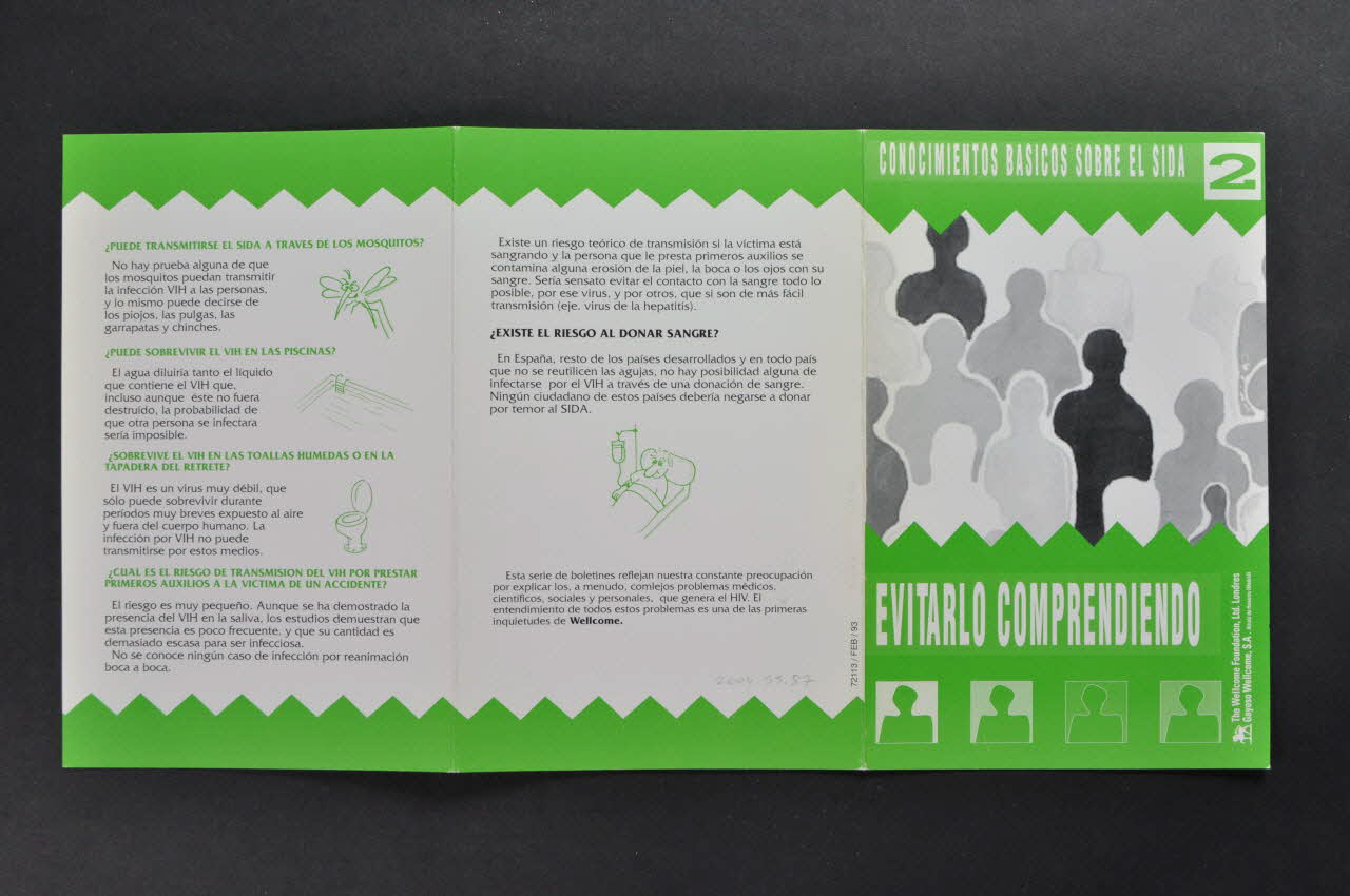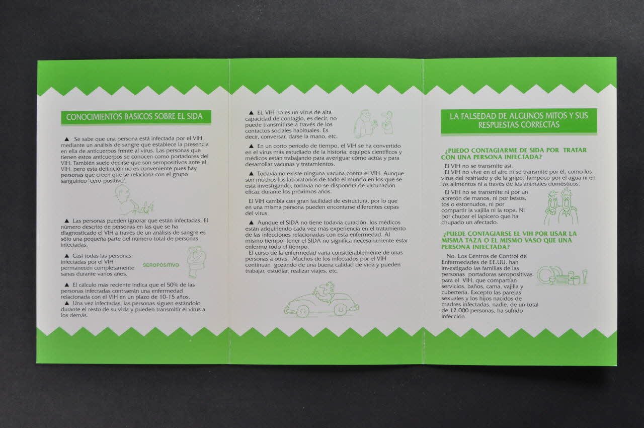 La couverture est sur fond blanc et est décoré de deux bandeaux verts se terminant en un feston et portant des inscriptions en espagnol. Au centre, sur fond blanc, figurent une série de silhouettes blanches, grises et noires. Le dos est mis en page de la même manière et figure un texte en caractères noirs. L'intérieur reprend une mise en page similaire avec des illustrations en vert et des titres de chapitre en blanc sur petits bandeaux verts introduisant à des textes en caractères noirs. Ils abordent les thémes suivants : - Dépistage - Pas de vaccin ni de traitement - Mythes relatifs à la transmission : ce qui ne transmet pas le VIH (contacts ordinaires / partage de couverts / moustiques / piscine / toilettes / premiers secours / don de sangInscriptions
