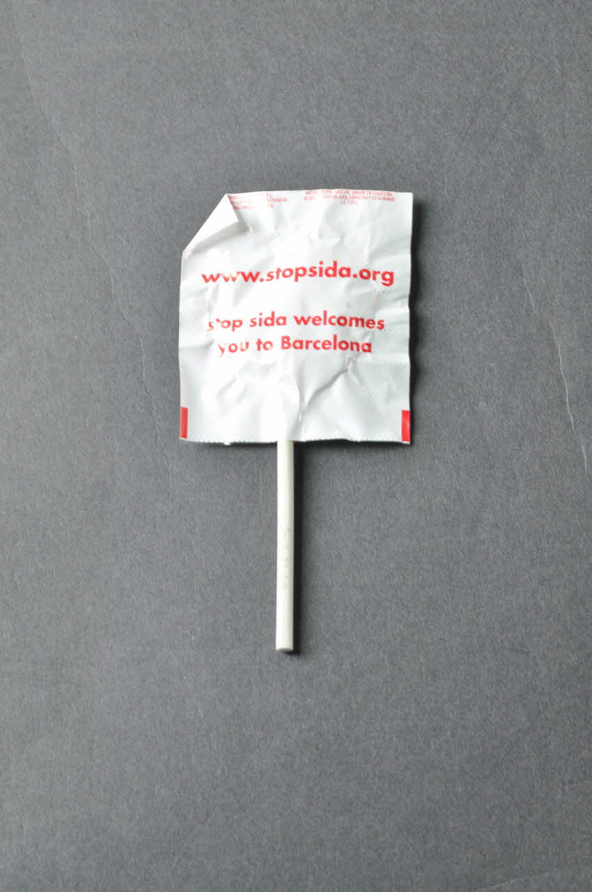 stop sida welcomes you to Barcelona (Sous l'adresse internet, en rouge sur fond blanc.)Matériaux et techniques