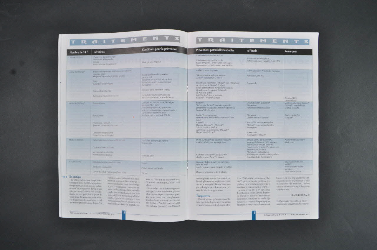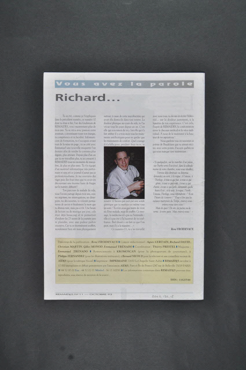 La revue se présente sous la forme d'un cahier de 24 pages en papier blanc, imprimées et agrafée entre elles. Il s'agit de la onzième publication de cette collection. La première de couverture présente un titre en lettres capitales bleues claires et bleues foncées soulignées d'un trait noir. Dessous, une bande en dégradés bleu, vert et jaune est inscrite en blanc, rappelant le statut de la revue. Dessous, la page s'organise en deux zones: un colonne jaune encadrée à gauche, avec la présentation du sommaire en lettres bleues. A gauche, sur fond blanc, l'édito est inscrit en lettres grises au-dessus d'une illustration. Intitulée "JE T'AIME", elle met en scène un personnage bleu, à la tête cornue. Au verso, un texte rédigé par le directeur de publication, rend hommage à un volontaire de l'association décédé récemment. Dessous, dans un encart jaune pâle, est présenté le comité de rédaction. A l'intérieur, l'organisation de la revue se fait comme suit: un article sur la maladie de Kaposi, traitements, témoignages;