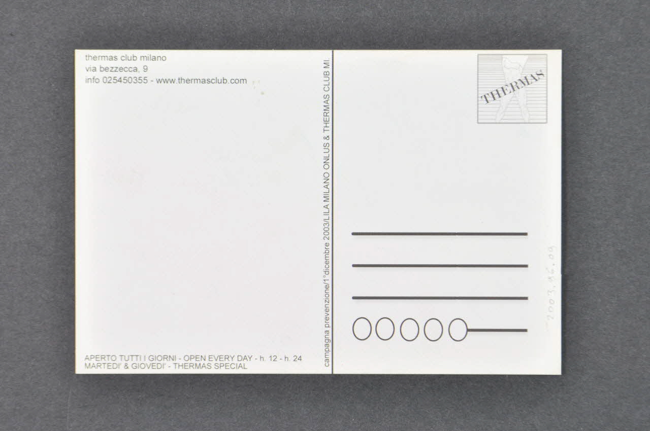THERMAS // CLUB MILANO (en bas à droite, avec un dessin stylisé de corps masculin se déshabillant), rectoLogo, nom d'association