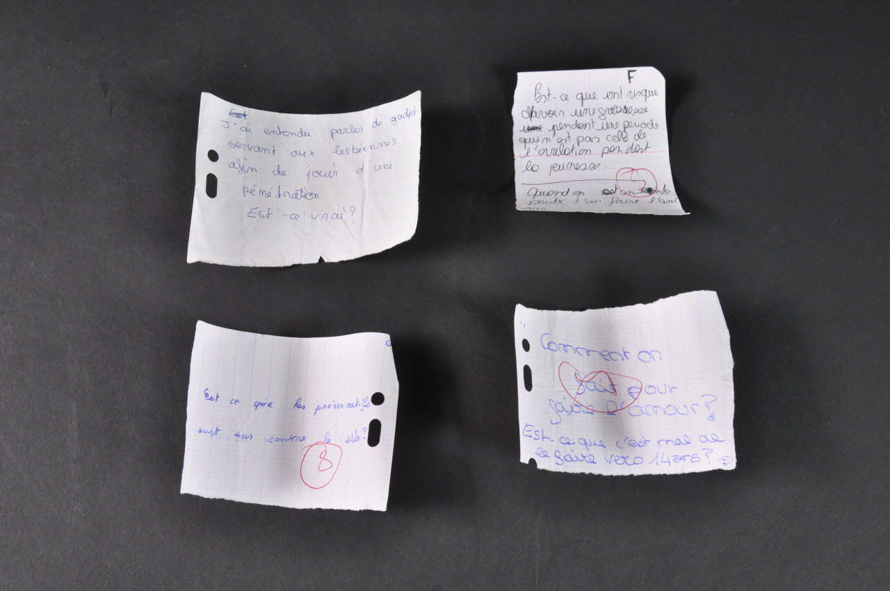 Exemple de méthode d'intervention de Benoît Félix (CRIPS) en collège. Chacun écrit un papier posant une question ou une remarque sur la sexualité. Anonyme mais en haut F ou G. Benoit lit les papiers et fait engager une discussion à ce sujet. Il garde ensuite les papiers enroulés et maintenus par un élastique en notant le collège et la classe.