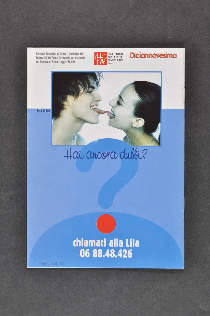 Progetto Educativa di Strada - Municipio XIX // Scheda 54 del Piano Territoriale per l'Infanzia // del Comune di Roma (Legge 285/97) // // LL // IA // LEGA ITALIANA // PER LA LOTTA // CONTRO L'AIDS // Lazio // // DICIANNOVESIMA (Imprimés en noir, blanc et rouge dans la partie supérieure), versoLogo