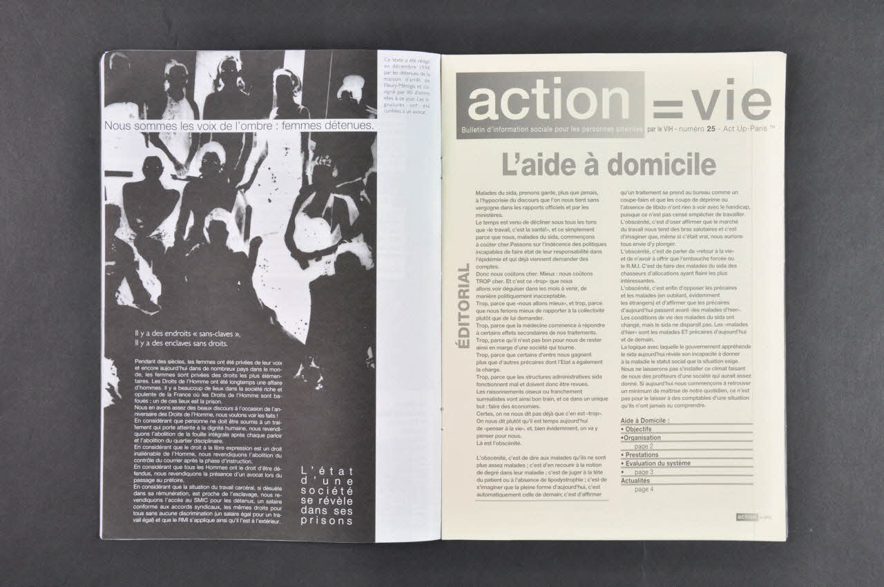 Précisions sur le contenu : - Editorial de Philippe Mangeot encadré de noir : "Où sont les pédés ?" (à propos de D. participant à une manifestation homophobe et contre le fantasme du lobby homosexuel. - Photos et récit de la manifestation du 31 janvier avec la bannière "homophobes" mise sur le Trocadéro - Test de résistance (sur fond gris) : demande de l'accès pour tous aux tests de résistance aux traitements - Primoinfection : témoignage : prise en charge avec traitement trop brutale dès la primo infection sans accompagnement psychologique - Le marronnier de Chicago : Vième conférence sur les rétrovirus et les infections opportunistes - Retour au travail si je peux, et si je veux (COTOREP, Allocation Adulte Handicapé, témoignage sur les difficultés du retour au travail) - Nous sommes les voix de l'ombre : femmes détenues Au centre. Encart sur pages jaunes, impression en noir et en gris. "Action = vie. Bulletin d'information sociale pour les personnes atteintes par le VIH. Numéro 25. En dessous, titre de l'encart :"L'aide à domicile" - Enquêtes sur le VIH en milieu carcéral et sur VIH et hépatites en Europe en milieu carcéral - Testeurs de drogues (vente illicite de "testeurs de drogues dans des bars / désaccord de l'association avec le SNEG) - Prise de conscience sur le sida à la Banque mondiale ? - Annonce de la 21ème Réunion Publique d'Information : Co-infection VIH et VHC. Dosages plasmatiques. - Muguet vaginal (sur fond noir) - Dernière page : fond noir. En blanc, en gros caractères :"Ignorance is your enemy". En dessous, photo d'imagerie médicale en noir et blanc. En dessous, à gauche : "Les publications d'Act Up-Paris