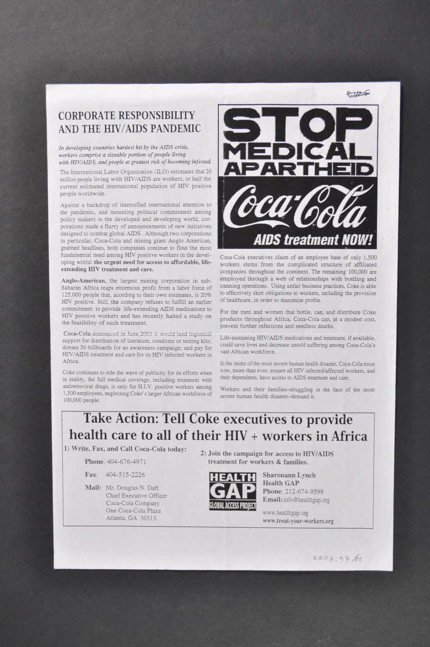 Stop medical apartheid / Coca Cola Aids treatment now (en haut, à droite), versoSOP COKE'S DEADLY NEGLECT: FIGHT FOR WORKERS & FAMILY TO HAVE ACCESS TO HIV/AIDS TREATMENT. (en bas), rectoTitre