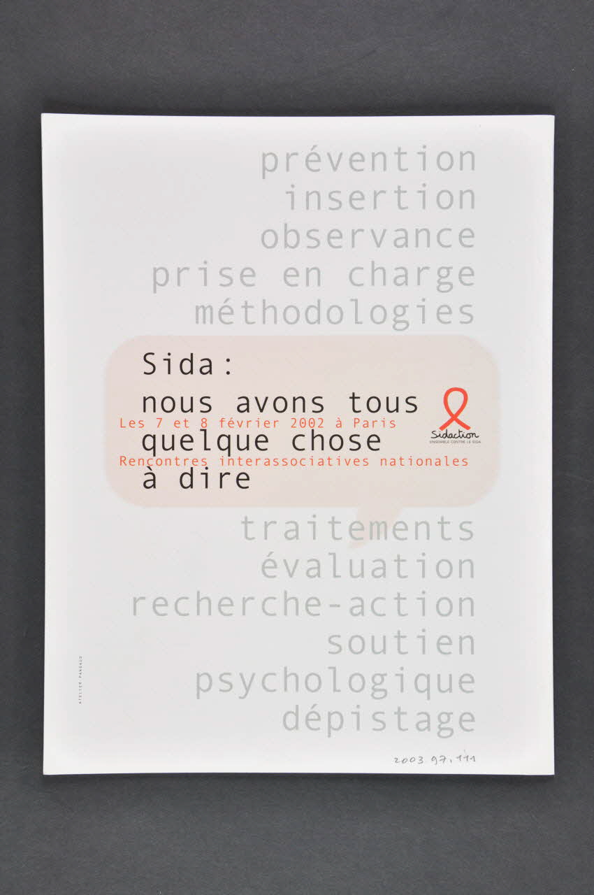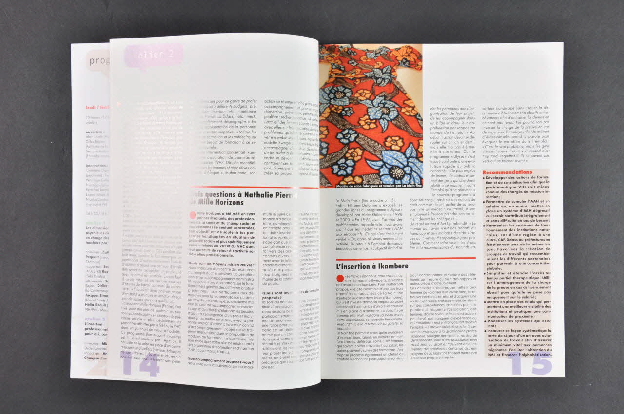 Interventions plénières // // - atelier 1 // Les dimensions psychiques de la prise en charge des personnes touchées par le VIH // // - atelier 2 // L'insertion professionnelle : pour qui ? comment ? // // - atelier 3. // Prévention : expériences et contenu des discours de prévention // // - atelier 4 // Prévention : personnes-relais et médiateurs, quelles méthodologies ? // // - atelier 5 // Dépistage et accès aux soins. Démarche de médiation. // // - atelier 6 // Nouveaux acteurs, nouveaux programmes : quelle structuration, quel soutien ? // // - atelier 7 // Le traitement du VIH et l'arrivée de nouvelles molécules. // // - atelier 8 // Recherche en sciences sociales et recherches-actions // // - Liste des associations (Imprimé en noir et couleur sur la page trois, colonne de gauche), à l'intérieurDate