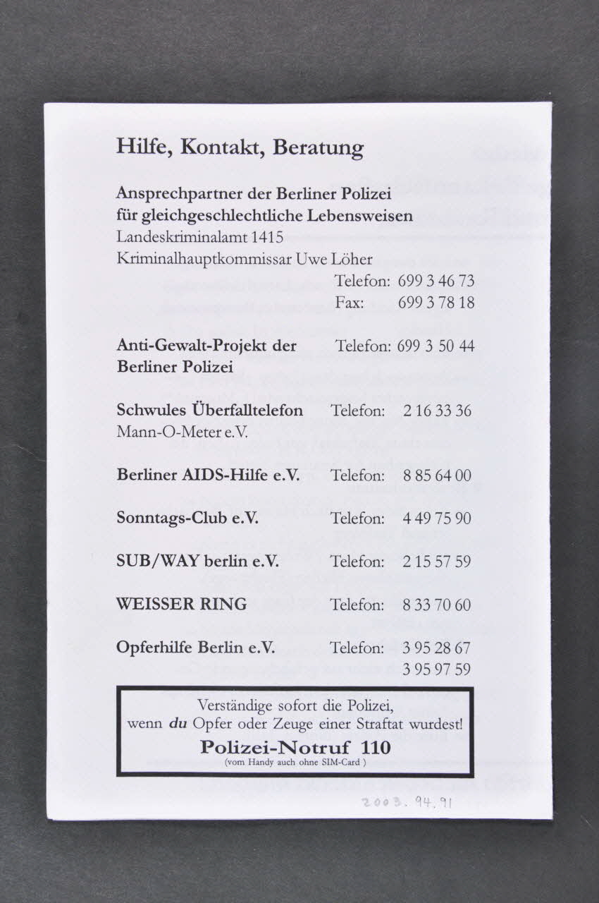 Au verso: figure une série de numéros de téléphones utiles : police, mais aussi ligne homosexuelle et Berliner Aids-Hilfe A l'intérieur: conseils donnés par la police de Berlin sur l'usage d'alcool et de drogues, se méfier des vols, des inconnus...