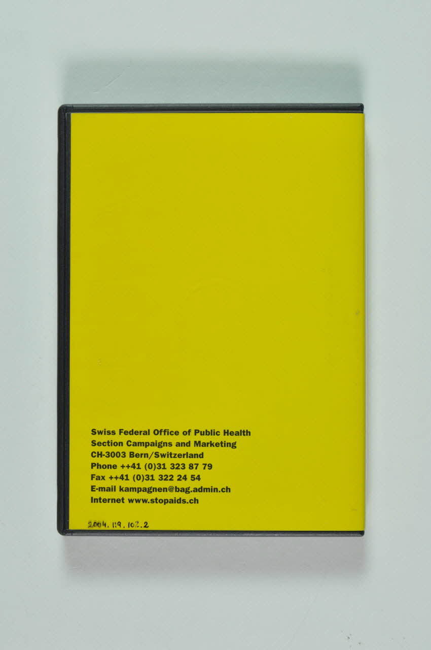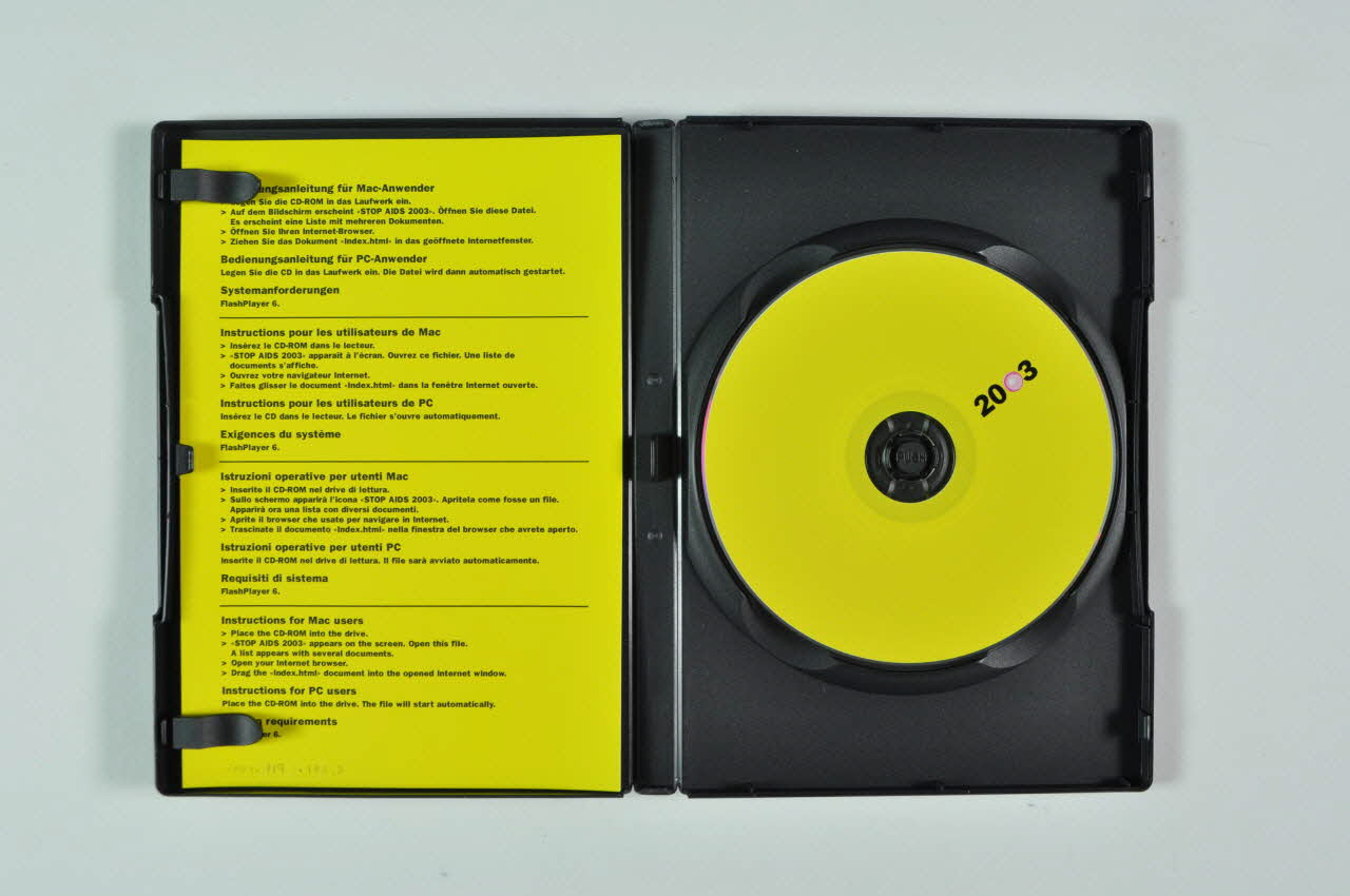 Le recto du CD est jaune vif avec une date inscrite sur la droite. Le boitier est en plastique noir, avec une pochette extérieure transparente dans laquelle est logée la jaquette. Celle-ci est en papier imprimé de couleur jaune vif, avec une large inscription en noir sur tout le devant. Un fascicule (.3) composé d'un feuillet simple d epapier blanc est glissé dans l'intérieur du boitier sur la gauche. Son recto est imprimé en jaune vif avec des inscriptions noires multilingues. Sur le CD : "2003" Il s'agit de documents de la campagne 2003 - 3 documents sur le lancement de la campagne en français, allemand, italien, anglais - 6 Icards mêmes langues - 44 posters (uniquement entièrement écrits sur fond jaune) : 102 allemands, 14 anglais, 10 français, 41 italien - Posters sur leur lieu d'affichage : 13 allemands, 10 français, 5 italiensInscriptions