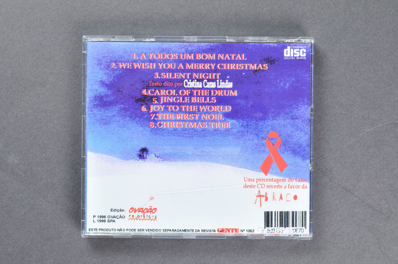 La couverture contient le livret. Double, il présente une couverture illustrée par un paysage de neige. Un homme avec un bâton se dirige vers une étable. Dans le ciel une étoile filante jaune. Au centre un ruban rouge. En haut, en rouge et blanc est inscrit le titre de l'album. A l'intérieur, avec un grand ruban rouge en sous impression, sont imprimés trois textes : "A todos um bom Natal" (A tous un bon Noël), "Merry Christmas" (en anglais, portuguais, allemand, français, italien, espagnol) et Sida nao e solidao (le sida n'est pas seul) : poème à l'amitié. Au dos, avec en sous impression un paysage de neige, figure la liste des chansons. En bas, on trouve la liste des musiciens et de chanteurs. Le CD, argenté, est placé dans la boîte. Il est illustré d'un grand ruban rouge et présente de nombreuses inscription.Inscriptions