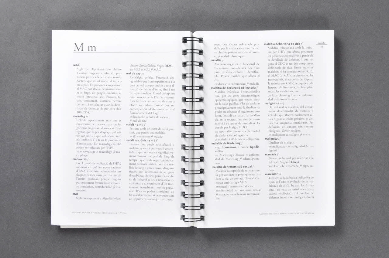 La couverture dispose d'un fond vert.On distingue en sous impression quelques termes médicaux. On trouve en biais traversant toute la couverture : un grand ruban rouge. En haut, à droite, est placé le titre et le nom de l'auteur en caractères blancs. La quatrième de couverture présente un fond vert clair avec en ton sur ton, des termes médicaux en sous impression ainsi qu'en biais un ruban croisé vert pâle. En bas, à gauche, se trouve le logo de la Generalitat de Catalunya. Les pages intérieures présentent un fond blanc avec des impression en noir. La présentation se fait sous forme alphabétique sur deux colonnes (termes et définitions en catalan) A partir de la page 139 se trouve un lexique anglais-catalan / castillan-catalan p.153/ français-catalan p.167 à p.180 puis de la page 181 à 184 les abréviations utilisées dans le glossaire puis de la page 185 à187 des préfixes, et enfin la liste des organisations non gouvernementales en Catalogne sur le Sida et une bibliographie.Inscriptions