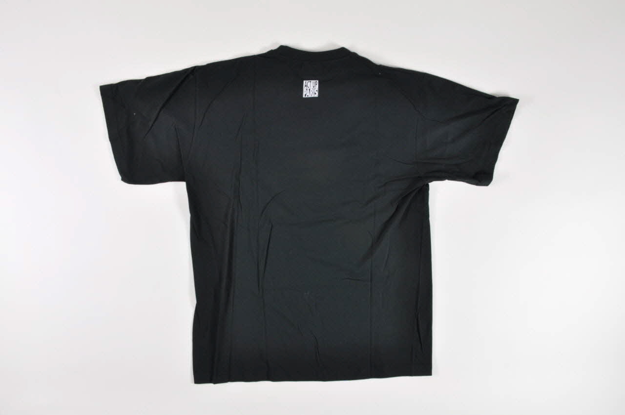 Tee-shirt noir taille S de marque METE à manches courtes et encolure ronde. Devant, double texte avec lignes en alternances, l'un en gros caractères blancs "Sida G8 : le mensonge tue", l'autre en petits caractères violets. Au revers, sous l'encolure, logo d'Act Up-Paris.Inscriptions