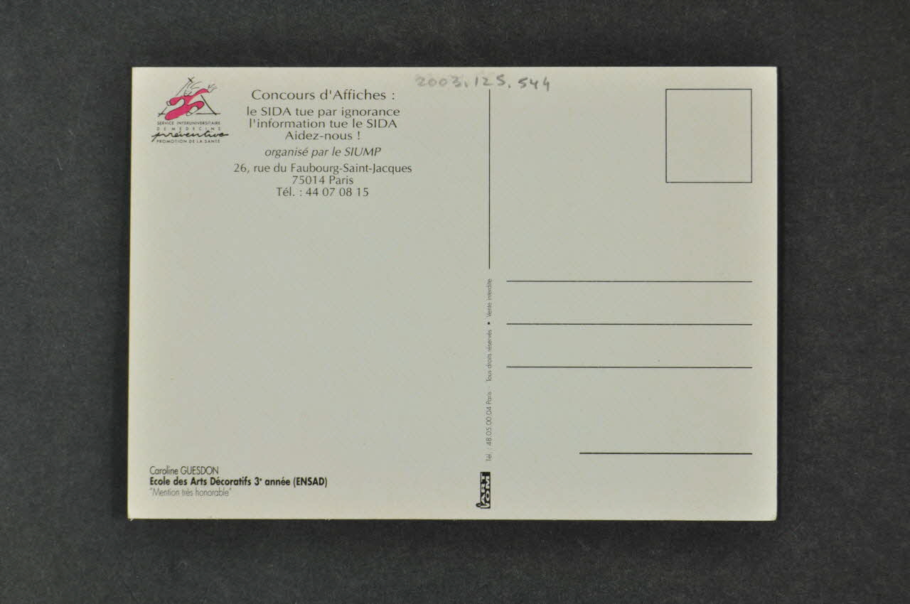 Concours d'Affiches: // Le SIDA tue par ignorance, // l'information tue le SIDA. // Aidez-nous ! // organisé par le SIUMP // 26, rue du Faubourg-Saint-jacques // 75014 Paris // Tél.: 44 07 08 15 (Imprimés en noir dans l'angle supérieur gauche), versoLogo