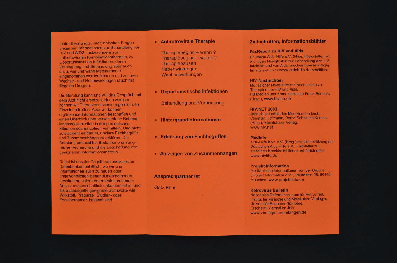 - Boehringer // Ingelheim // - Bristol-Myers Squibb // - gsk GlaxoSmithKline // - Roche (quatre logos en bas du feuillet 4), à l'intérieurSCHWULEN // BERATUNG (dans le coin inférieur gauche), versoDate