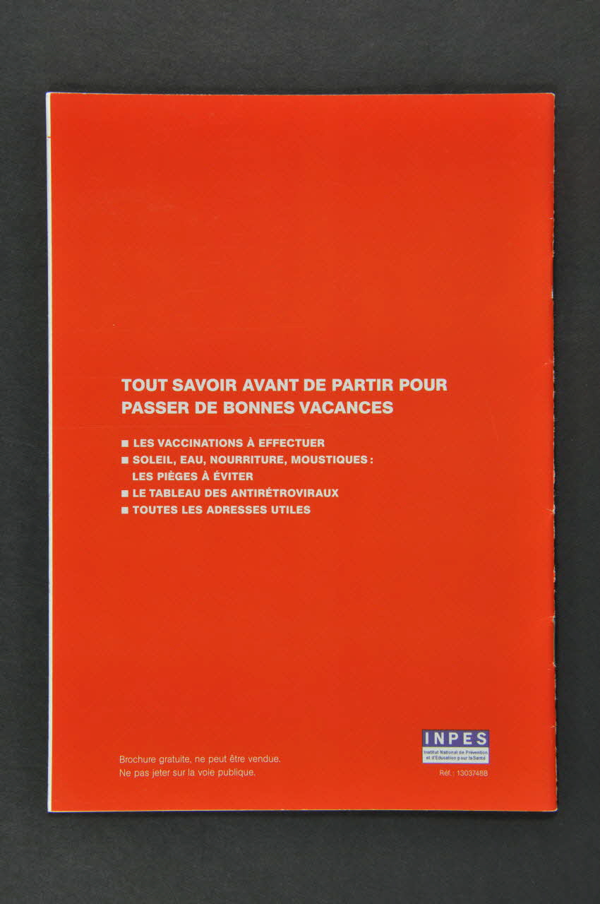 Première page : logos des sponsors : Abbott, Boehringer Ingelheim, MSD-Infectiologie, Schering-Plough et (diffusion) INPES, SNEG, Sida Info Service Sommaire Avant de partir Consultez votre médecin A ne pas oublier Voyager en Europe : le formulaire E 111 Vaccinations nécessaires Que mettre dans ses bagages ? (traitements VIH, autres médicaments, préservatifs... Législation : Liste de pays dans lesquels les conditions d'entrée des personnes séropositives sont restrictives Pendant le voyage Prendre avec soi ses médicaments Le décalage horaire Se protéger du paludisme Sur le sable Le soleil, un faux ami? Que boire en vacances ? Lutter contre la diarrhée Alimentation et hygiène A votre retour Etre à l'écoute de son corps Tableau des molécules Nom / modalités de prise / Précautions d'emploi Adresses utiles En dernière page, logo de Sida Info Service, accessible à partir de l'étranger.