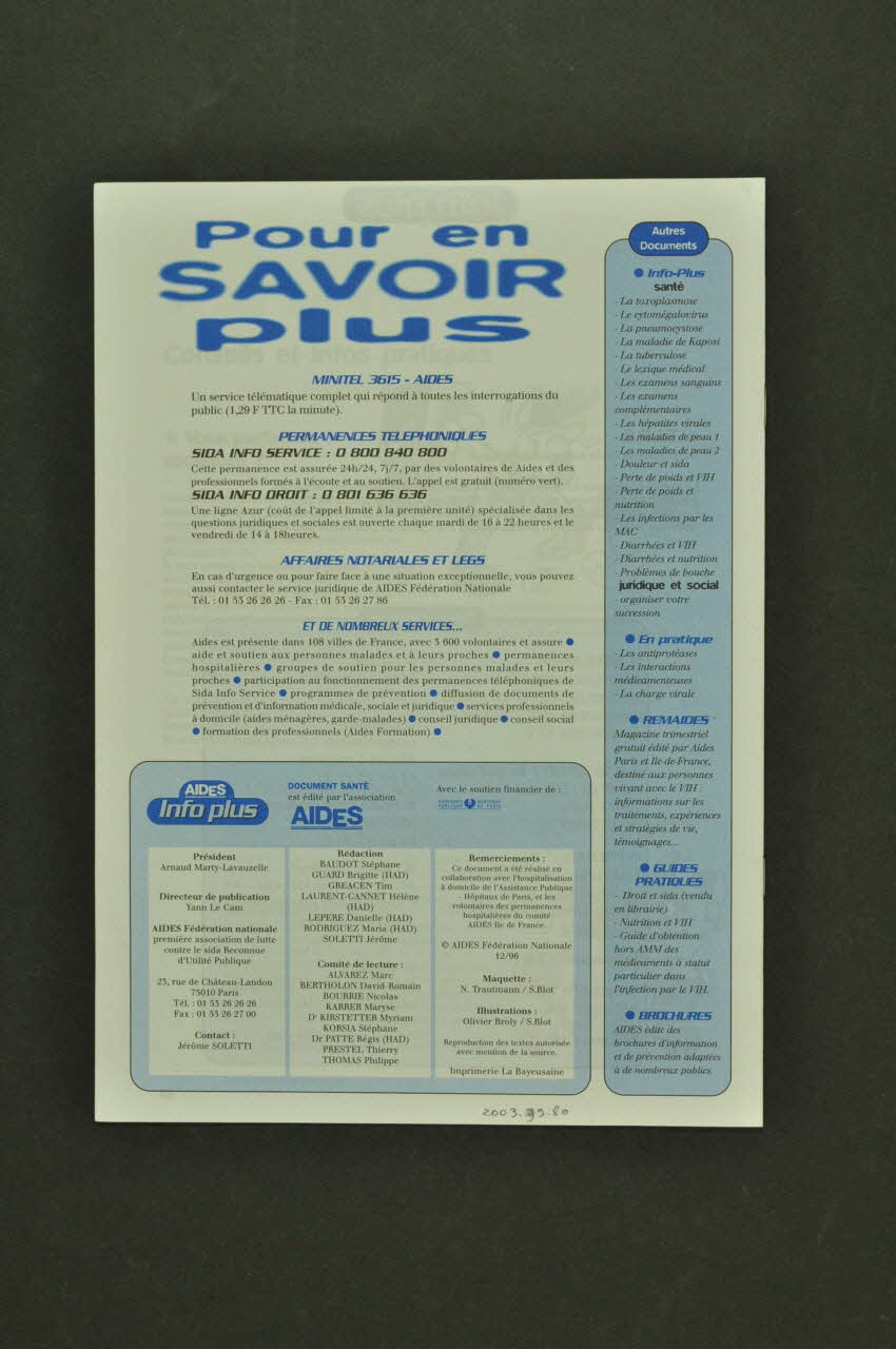 Ce document rectangulaire vertical est imprimé dans son ensemble en noir et en bleu (clair et foncé). Plié en deux et relié par deux agrafes, il compte seize pages de texte avec des illustrations. Sur la couverture figurent des informations telles que : titre, thème, sommaire, date de parution. Sur la quatrième de couverture on trouve notamment des informations pratiques telles que : coordonnées minitel, téléphoniques et postales de l'AIDES, la liste du bureau, du comité rédacteur et de lecture ainsi qu'une liste de la documentation disponible auprès de l'association.