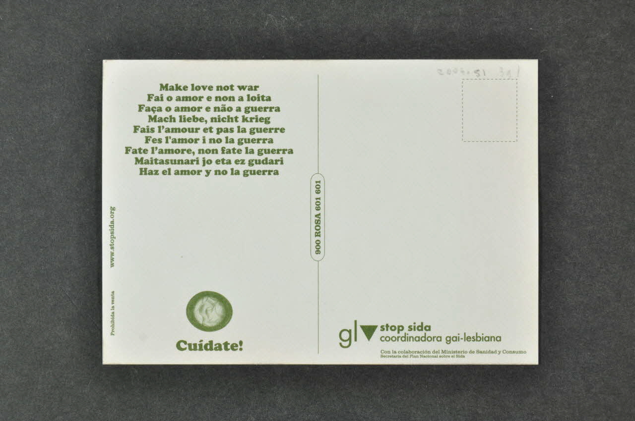 gl stop sida // coordinadora gai-lesbiana // // Con la colaboracion del Ministerio de Sanidad y Consumo // Secretaria del Plan National sobre el Sida (en bas à droite), versoDécor