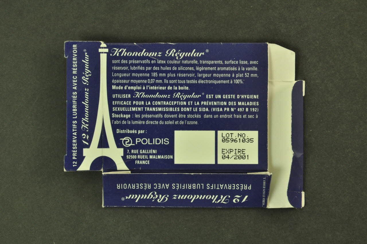 "12 Khondomz Regular" // en dessous : "12 préservatifs lubrifiés avec réservoir" . (devant)"Utiliser Khondomz Regular est un geste d'hygiène efficace pour la contraception et la prévention des maladies sexuellement transmissibles dont le sida." // Distribués par POLIDIS // 7 RUE GALLIENI // 92500 RUEIL MALMAISON // n° de lot, expire 04 2001 (dos)Décor