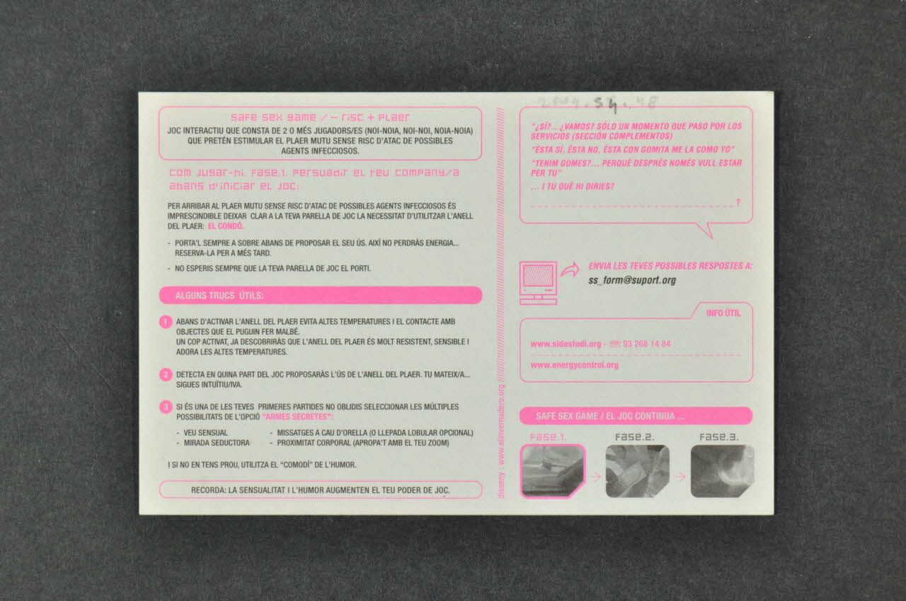 Le recto présente une photographie en noir et blanc imprimée au format paysage, qui montre deux doigts d'une main prenant un préservatif sur une table, posé à côté d'un verre d'eau.