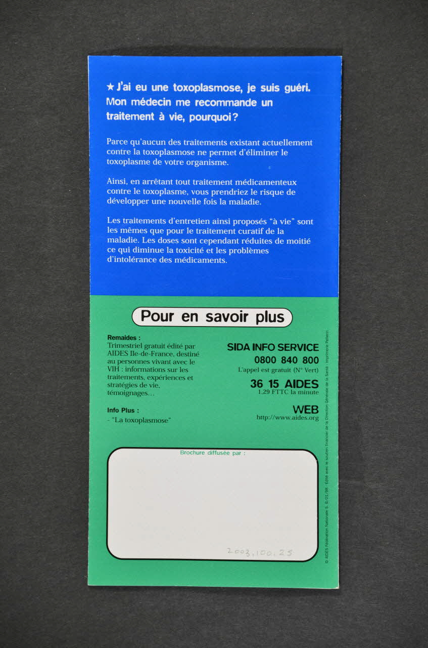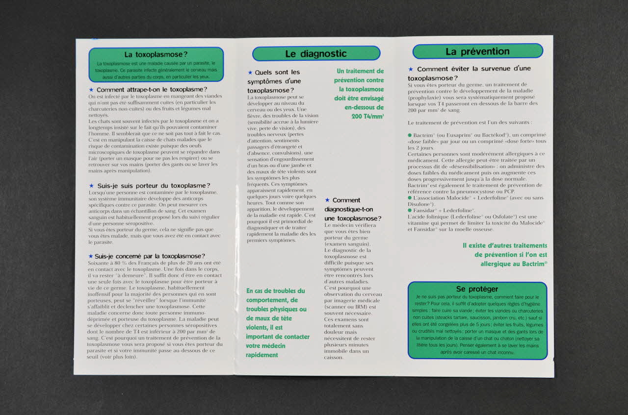 La toxoplasmose est une maladie causée par un parasite : le toxoplasme. Ce parasite infecte généralement le cerveau, mais aussi d'autres parties du corps, en particulier les yeux. // Comment attrape-t-on la toxoplasmose ? // [...] // Suis-je porteur du toxoplasme ? // [...] // Suis-je concerné par la toxoplasmose ? // [...] // Le diagnostic // Quels sont les symptômes d'une toxoplasmose ? // [...] // Comment diagnostique-t-on une toxoplasmose ? // [...] // Un traitement de prévention contre la toxoplasmose doit être envisagé en-dessous de 200 T4/mm2 // // En cas de troubles du comportement, de troubles physiques ou de maux de tête violents, il est important de contacter votre médecin rapidement. // // La prévention. // Comment éviter la survenue d'une toxoplasmose ? // [...] // Il existe d'autres traitements de prévention si l'on est allergique au Bactrim // [...] // // Le traitement // Comment traiter une toxoplasmose ? // [...] // Quels sont les effets secondaires de ces médicaments ? // [...] // On ne se débarrasse jamais du toxoplasme, c'est pourquoi il est important de maintenir un traitement préventif quand l'immunité est affaiblie. (Imprimé en noir sur blanc ou vert ou en vert sur blanc), à l'intérieurest une maladie qui atteint souvent le // cerveau. Elle est fréquente // chez les personnes atteintes par le VIH lorsque // l'immunité est affaiblie. // Il existe des traitements le plus souvet // efficaces pour éviter l'apparition de cette // maladie. Cependant, en cas d'échec de // ces traitements, la toxoplasmose se // développe rapidement et s'accompagne // de troubles spécifiques qu'il faut savoir // reconnaître pour pouvoir traiter le plus // tôt possible avec d'autres médicaments. (Imprimé en bleu sur blanc dans la hauteur du dépliant), sur la couvertureNuméro