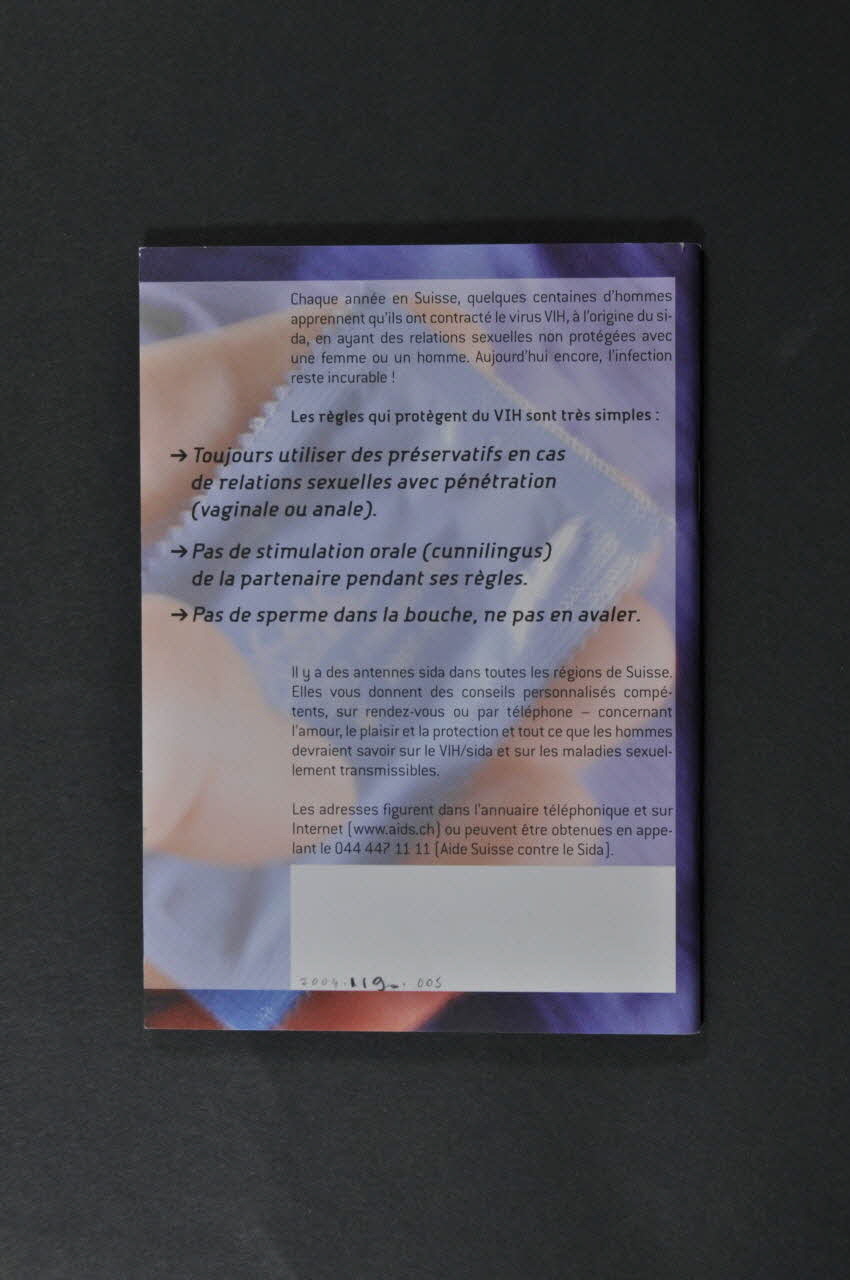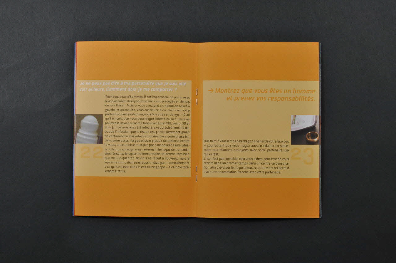 La couverture présente une vue en détail un soutien-gorge de femme marron, image sur laquelle se détachent des inscriptions blanches. Le dos de la brochure comporte une photographie d'une main tenant un préservatif dans son emballage bleu. Par-dessus la photographie se trouvent des inscriptions noires et un cadre blanc dans le coin inférieur droit. L'intérieur de la brochure comporte des inscriptions majoritairement en noir et en blanc sur des fonds bleus, jaunes, rouges, oranges, marrons et verts. Chaque page est bordée d'une couleur plus foncée sur trois côtés. Une petite vignette carré avec une photographie couleur se trouve au milieu à gauche des pages paires et au milieu à droite des pages impaires.Inscriptions