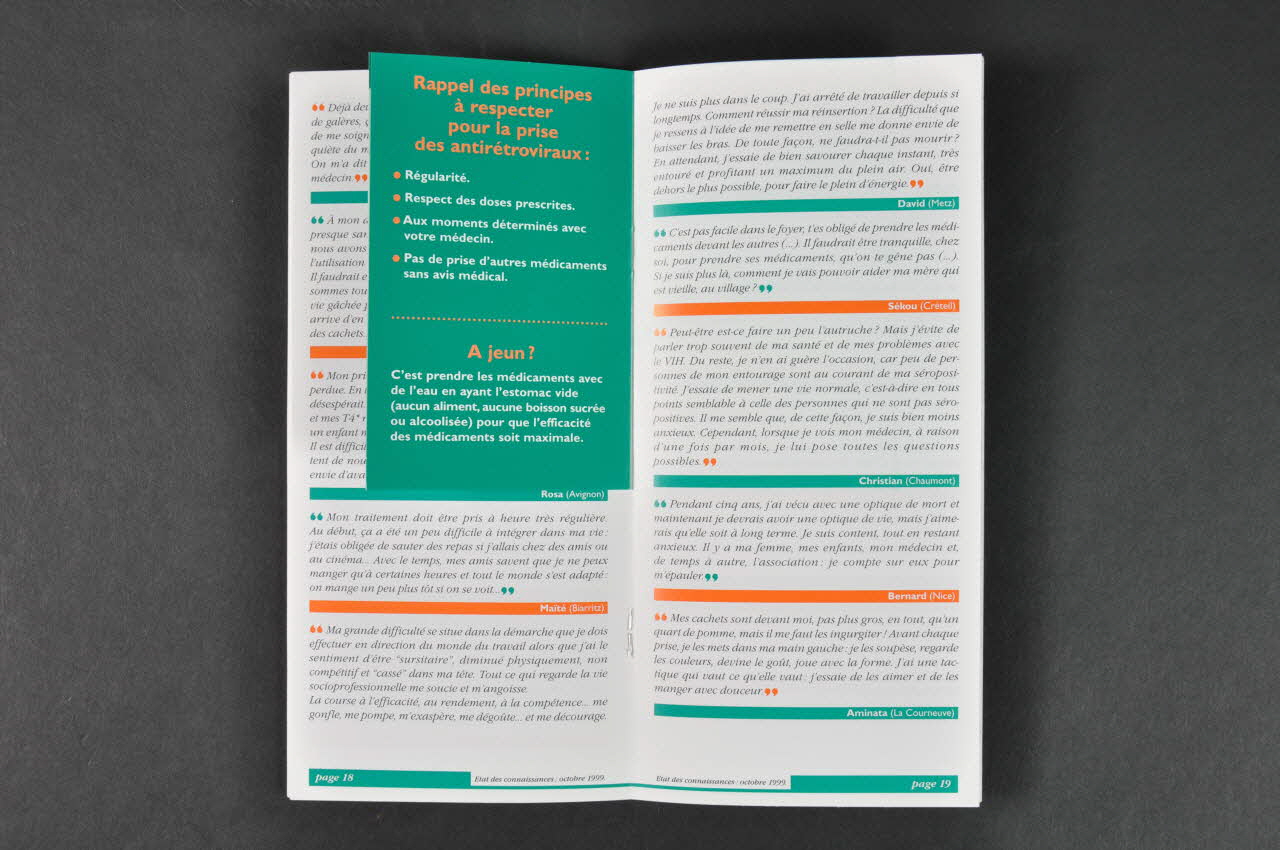 Sommaire // // DES MEDICAMENTS SPECIFIQUES // ET UN DISPOSITIF DE DISTRIBUTION // PARTICULIER page 3 // IMPORTANT A SAVOIR page 4 // PRISE DES ANTIRETROVIRAUX: // PRINCIPES GENERAUX page 5 // LES ANTIRETROVIRAUX AU QUOTIDIEN page 6 // [...] (A l'intérieur de la couverture, en caractères noir et verts sur fond blanc), à l'intérieurSous-titre