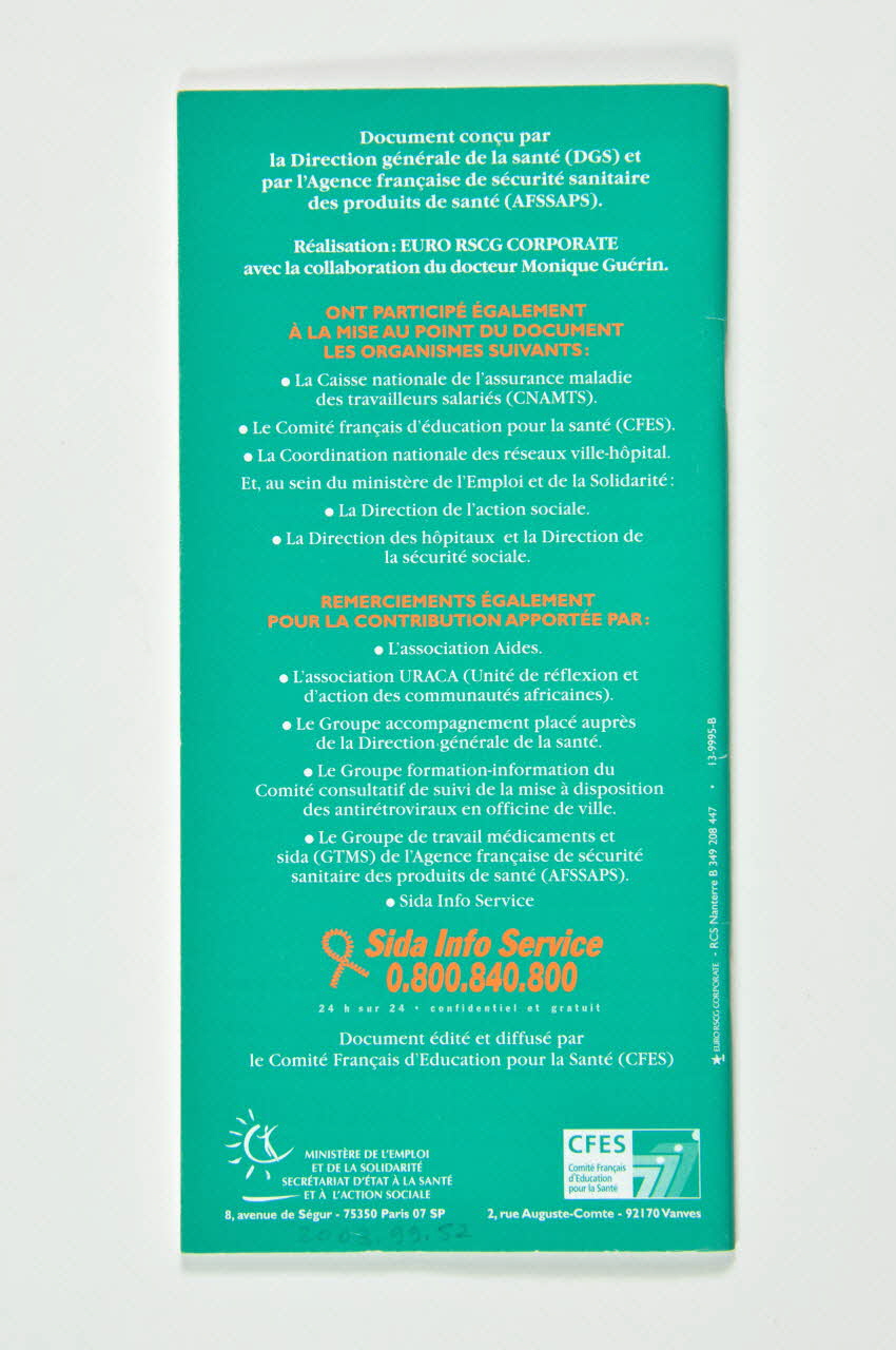 La couverture se compose d'un fond vert et d'une photographie floue colorée en vert de deux personnes marchant. Quelques pétales verts contournent le côté gauche de la photographie. Le titre et le sous-titre, avec la date, sont inscrits en blanc en dessous de la photographie. Les logos du ministère de l'Emploi et de l'Agence française des Produits de Santé sont placés dans la partie inférieure de la couverture. Le recto présente un texte en blanc et en orange sur un fond vert uniforme. Il y a le logo en orange de Sida Info Service avec le ruban rouge et ceux du ministère de l'Emploi et du CFES. A l'intérieur, les textes sont sur fond blanc en vert, orange et noir. L'intérieur de la couverture présente un sommaire. Au centre, agrafé, il y a un petit mémo vert détachable pour la prise des médicaments.Inscriptions