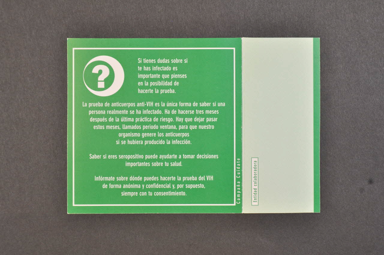 Si tienes dudas sobre si // te has infectado es // importante que pienses // en la posibilidad de // hacerte la prueba // [...] // Infórmate sobre dónde puedes hacerte la prueba del HIV // de forma anónima y confidential y, por supuesto, // siempre con tu consentimiento., versoSous-titre, texte