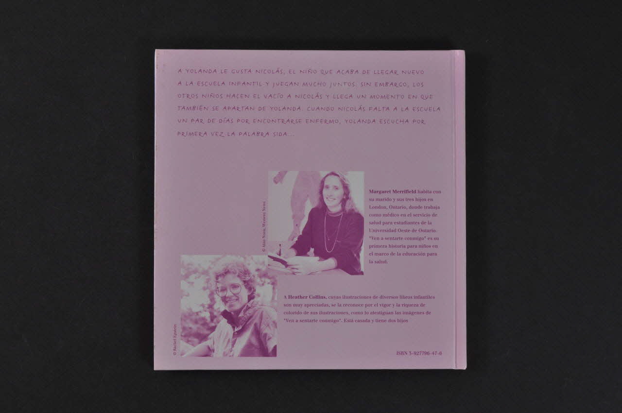 La couverture représente un groupe d'enfants jouant ensemble, déguisés avec des ailes jaunes et des casques verts. Ils accueillent avec le sourire, les bras tendus un petit garçon timide arrivant vers eux. En haut, en italiques, en lettres violettes, on trouve le titre inscrit en espagnol : "Ven a sentarte conmigo" (en espagnol) (Viens t'asseoir près de moi). En bas, sur bandeau rose, inscription violette indiquant le nom de l'auteur et de l'illustrateur.