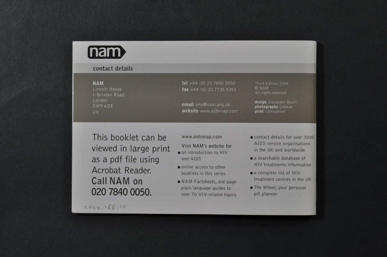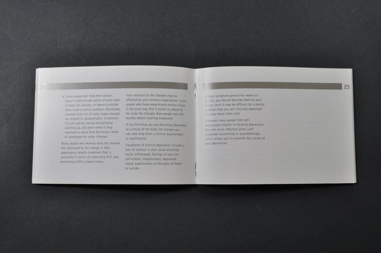 information series for hiv-positive people (inscription en gris foncé sur fond gris dans la bande verticale en haut de la couverture, au-dessus du titre), sur la couvertureDécor
