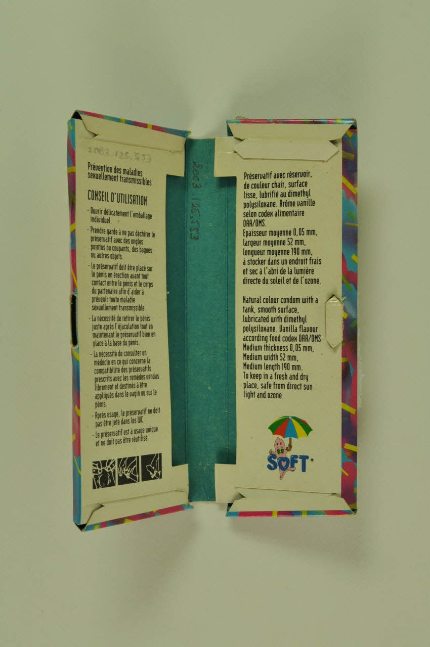 Cette boîte rectangulaire en papier cartonné ne contient plus de préservatifs. Elle s'ouvre par le milieu. Le motif du fond est multicolore (bleu, rose, violet, jaune, vert). Plusieurs inscriptions y figurent.Inscriptions
