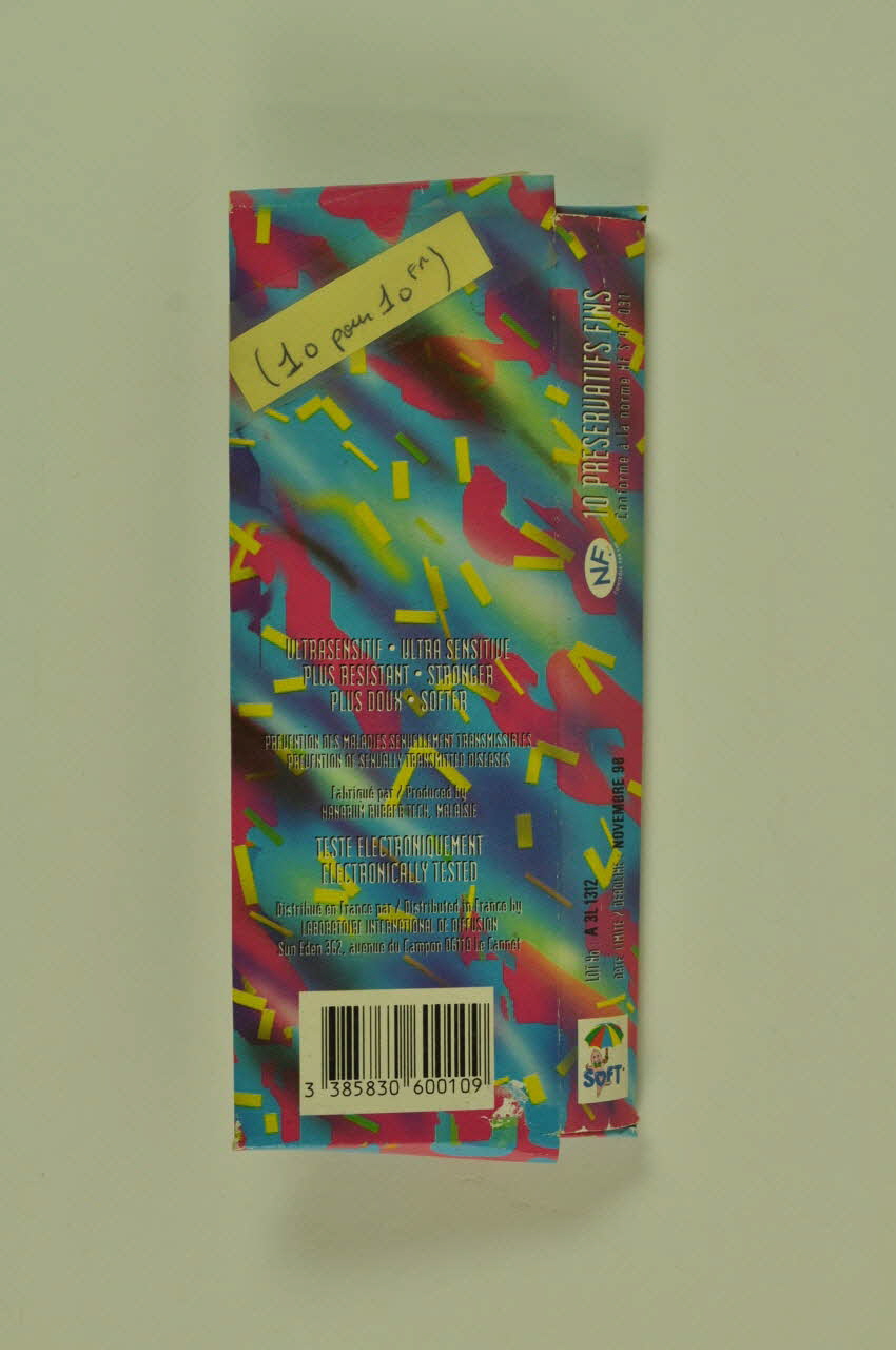 Sur la tranche sont visibles (de gauche à droite) : le logo de SOFT, le n° de lot : A 3L 1312, la date limite/deadline : NOVEMBRE 98, la mention NF ainsi que la désignation du produit : 10 PRESERVATIFS FINS / Conforme à la norme NF S 97-031. (Cette boîte rectangulaire en papier cartonné comporte plusieurs inscriptions.), au centreétiquette manuscrite : (10 pour 10 Fr) // // ULTRASENSITIF . ULTRA SENSITIVE / PLUS RESISTANT . STRONGER / PLUS DOUX . SOFTER / Prévention des maladies sexuellement transmissibles / Prevention of sexually transmitted diseases / Fabriqué par . Produced by / HANARUM RUBBER TECH, MALAISIE / TESTE ELECTRONIQUEMENT / ELECTRONICALLY TESTED / Distribué en France par . Distributed in France by / LABORATOIRE INTERNATIONAL DE DIFFUSION / Sun Eden 362, avenue du Campon 06110 Le Cannet. (Cette boîte rectangulaire en papier cartonné comporte plusieurs inscriptions. Au dos de l'emballage se trouvent d'une part une étiquette manuscrite (Post-it découpé et collé à l'aide de Scotch) et d'autre part les différentes caractéristiques du produit :), versoDécor