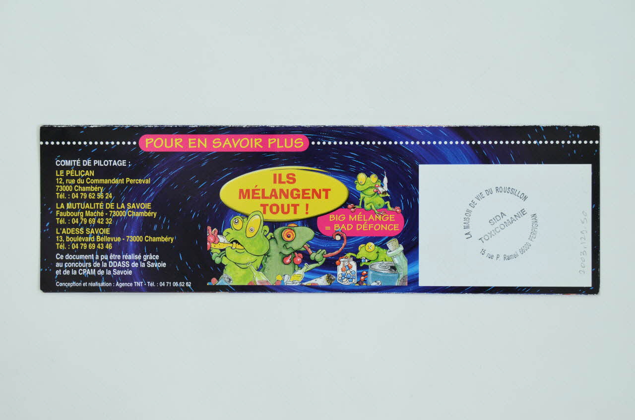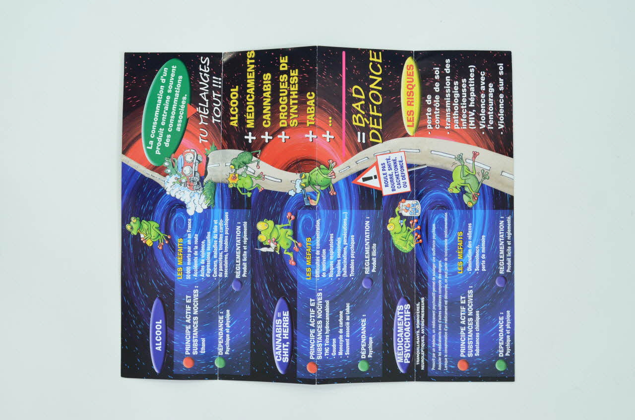 Le dépliant se déplie verticalement et l'image s'étend sur l'ensemble des volets intérieurs. La première face comporte le même fond bleu spiralé que sur la couverture. Une série d'inscriptions figure à gauche dans trois encadrés distincts. A côté de chaque encadré, une grenouille est représentée : une grenouille avec un biberon d'alcool, une fumant des produits illicites et une autre avalant des comprimés. Sur la droite, de haut en bas, se trouve une route grise sur laquelle deux grenouilles se battent, une se tire une balle dans la tête, et deux autres s'enlacent. En haut de la route, une voiture rouge pétaradant est conduite par une grenouille tenant à la main une bouteille. En bas de la route, un panneau rectangulaire avec une inscription en bleu est surmonté par un panneau d'interdiction triangulaire. A droite de la route, une inscription est imprimée en blanc et en jaune.